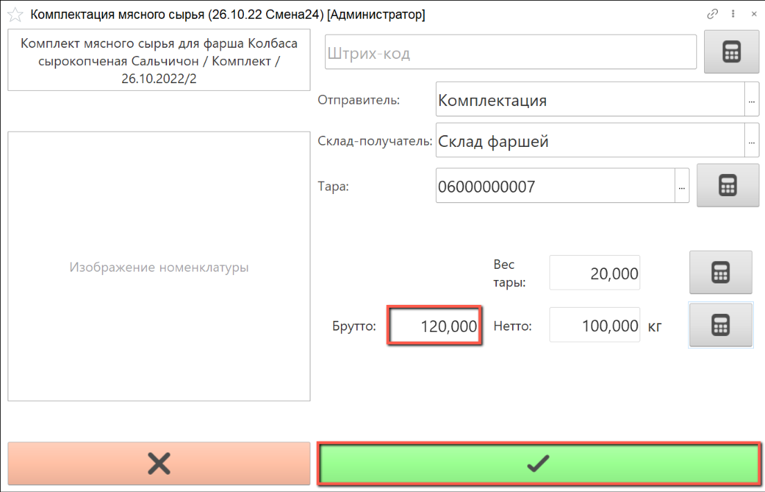 Получаем вес брутто с весов, вес нетто рассчитается автоматически.