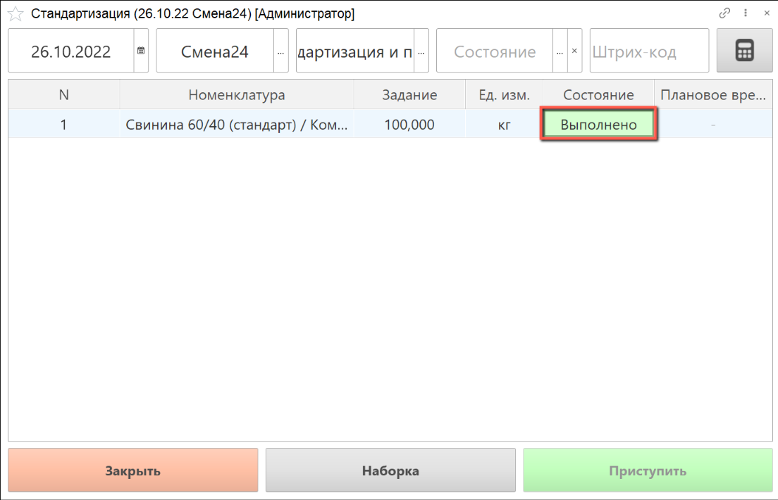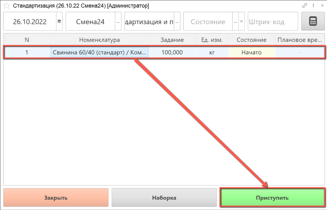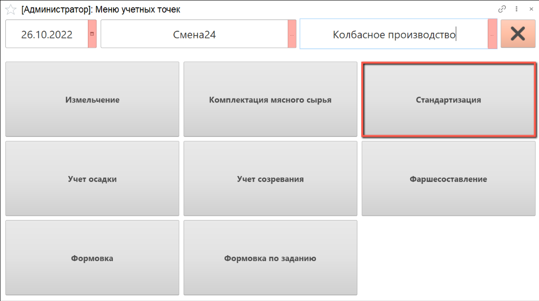 - Указываем дату смены, смену и рабочий участок, на котором будет выполняться стандартизация сырья.