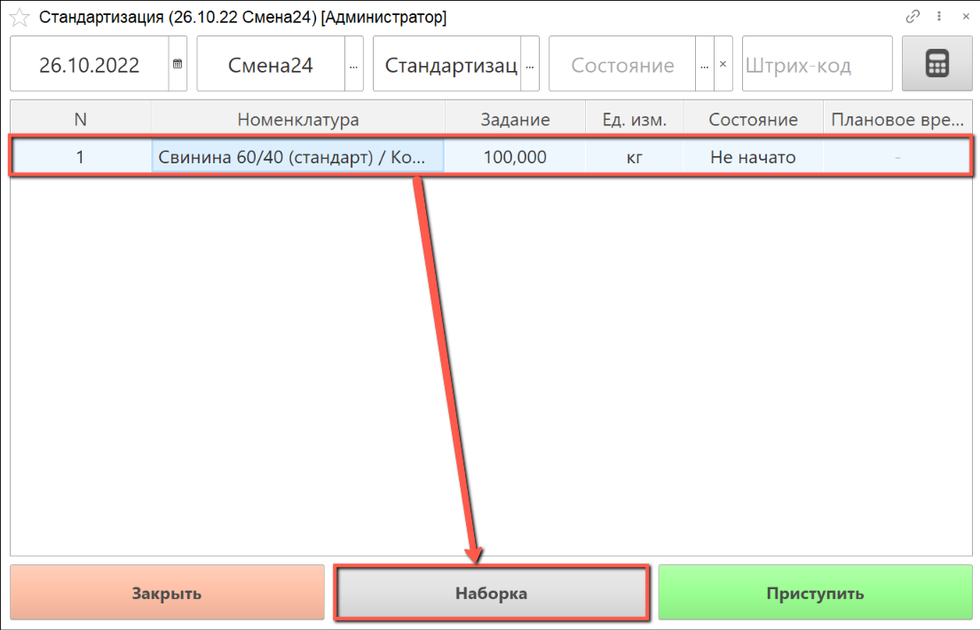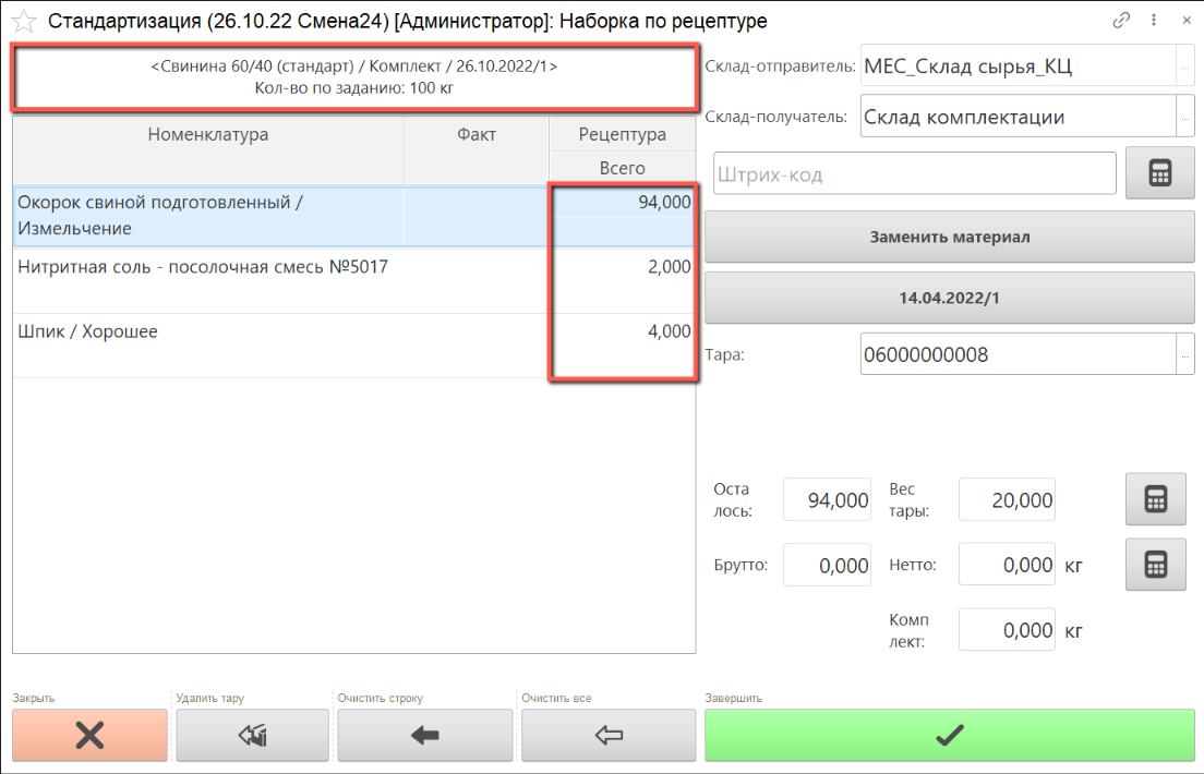 - Открылось окно наборки: слева находится информация о партии производимого полуфабриката и рецептура для наборки с указанием планового веса ингредиентов.