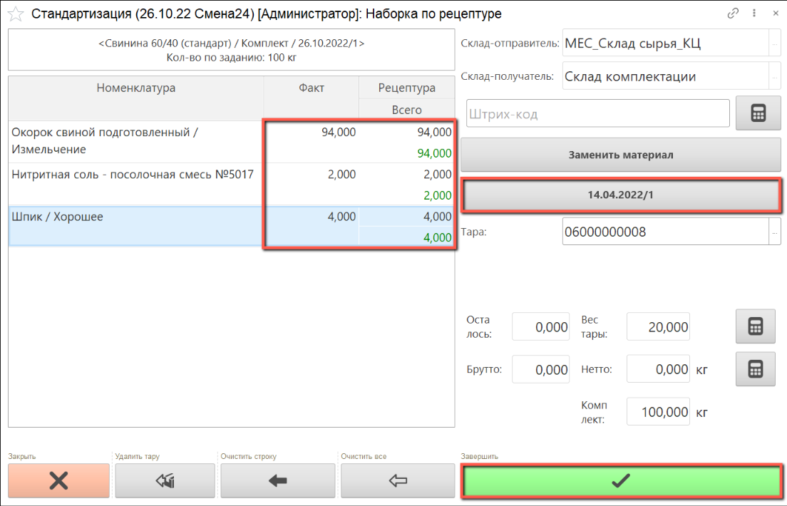 По завершении взвешивания стандартизованного сырья нажимаем кнопку "Завершить":