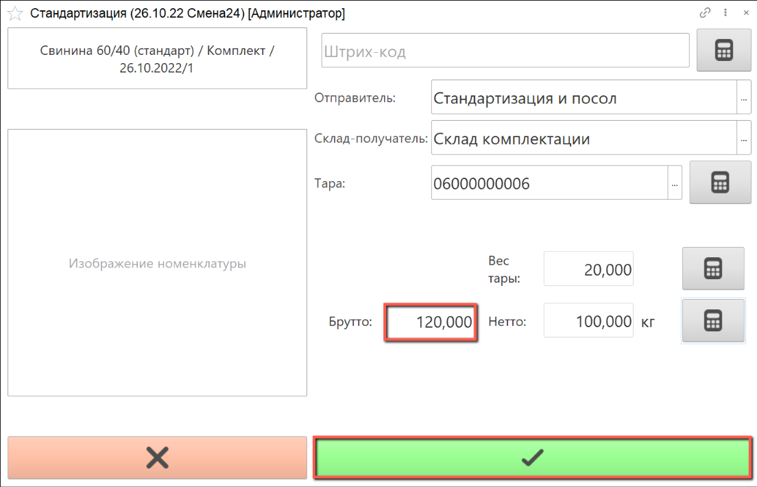 Получаем вес брутто с весов, вес нетто рассчитается автоматически.