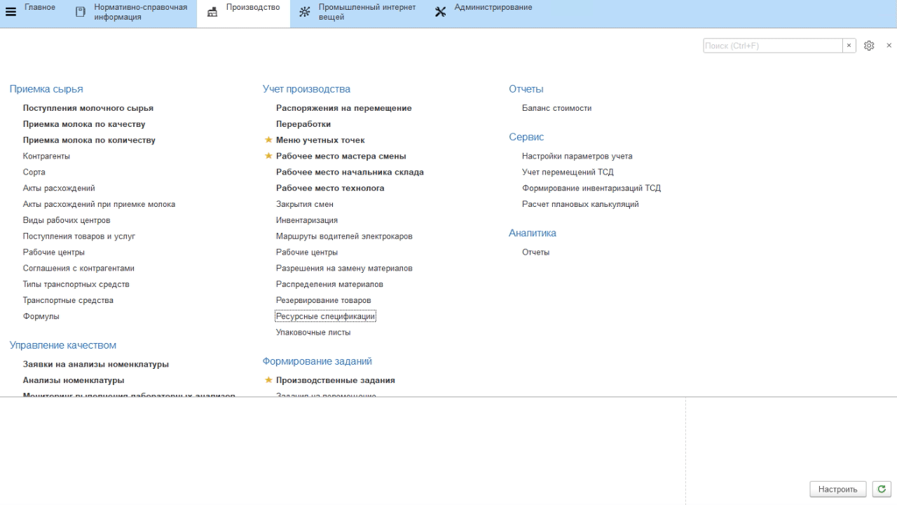 Ресурсные спецификации по нормативному расходу сырья на этапе нормализации молока задаются в справочнике "Ресурсные спецификации". При этом на нормализованное молоко разной жирности задаются разные спецификации.
