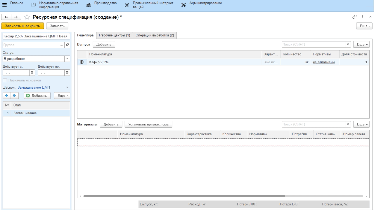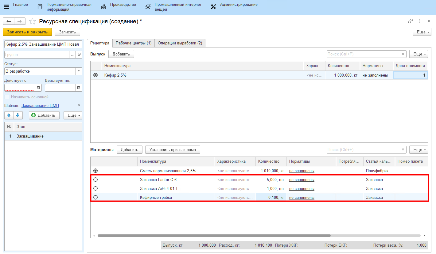 - По кнопке "Добавить" перечислить в таблице материалов закваски и другие ингредиенты, необходимые для сквашивания. Указать их нормативные объемы: