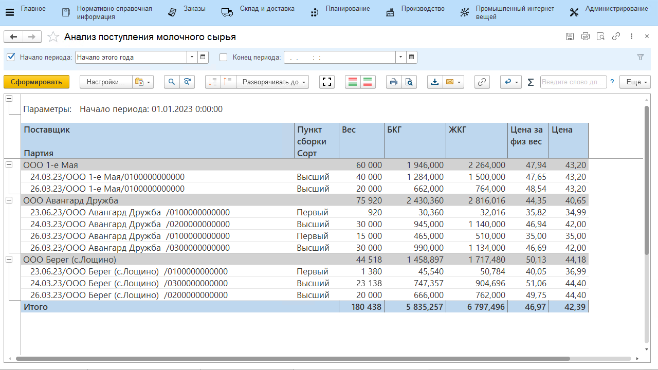 - Открыть отчет "Анализ поступления молочного сырья";