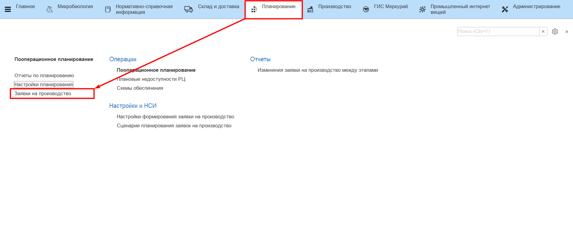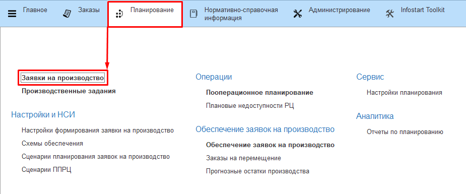 - Перейти в раздел Планирование, открыть справочник "Заявки на производство";