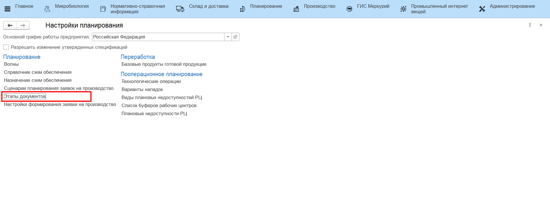 - Перейти в раздел Планирование -> Настройки планирования, открыть справочник "Этапы документов";