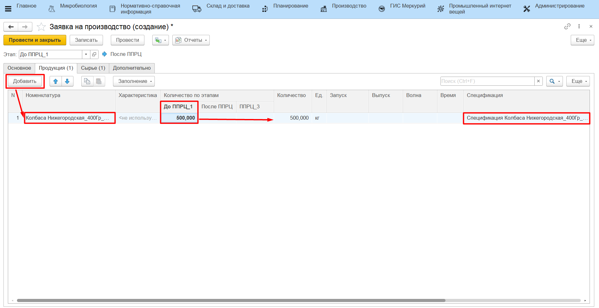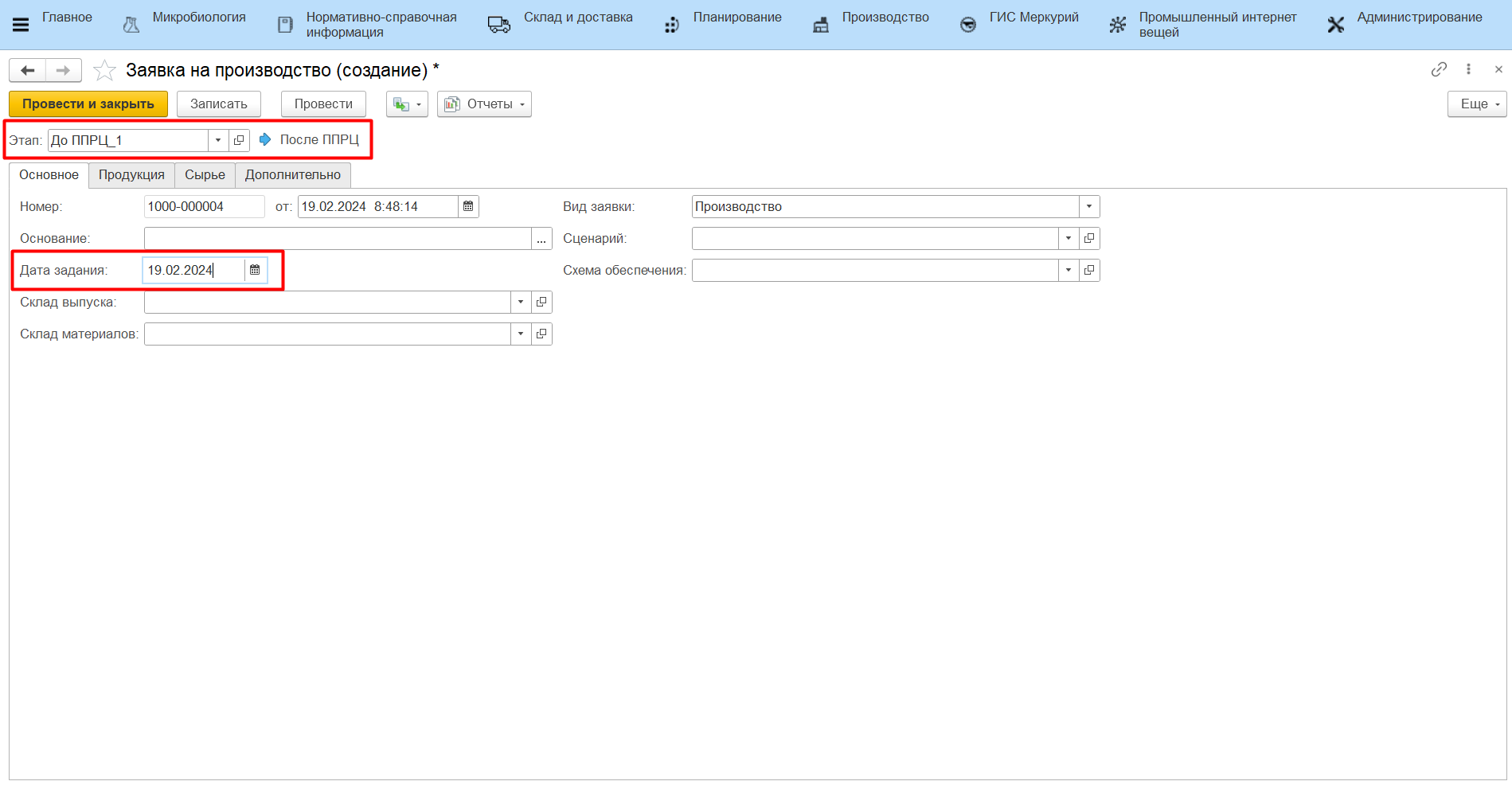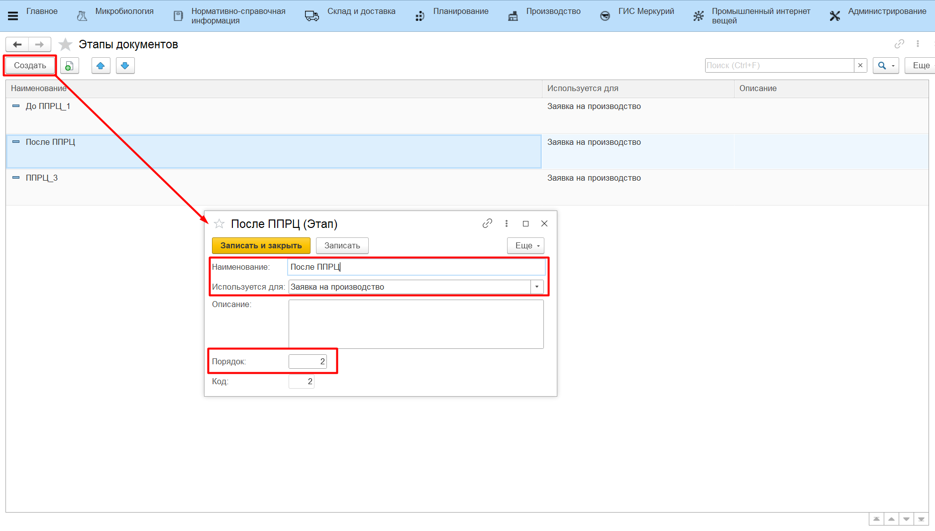 Созданные этапы автоматически подтягиваются в документы "Заявка на производство".