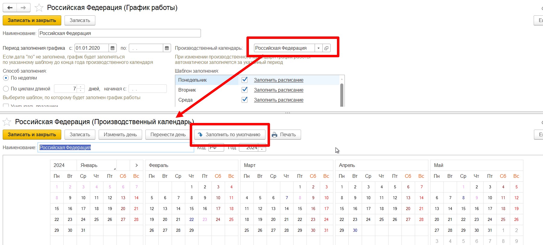 - Проверить календарь в установленном графике, в нем должны быть рабочие(черные) дни в выбранный интервал планирования. Если в нем все дни красные, то необходимо заполнить календарь по умолчанию..