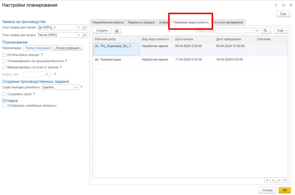 Доступность рабочего центра определяется либо графиком работы, либо ручной установкой плановой недоступности в настройках АРМа ППРЦ
