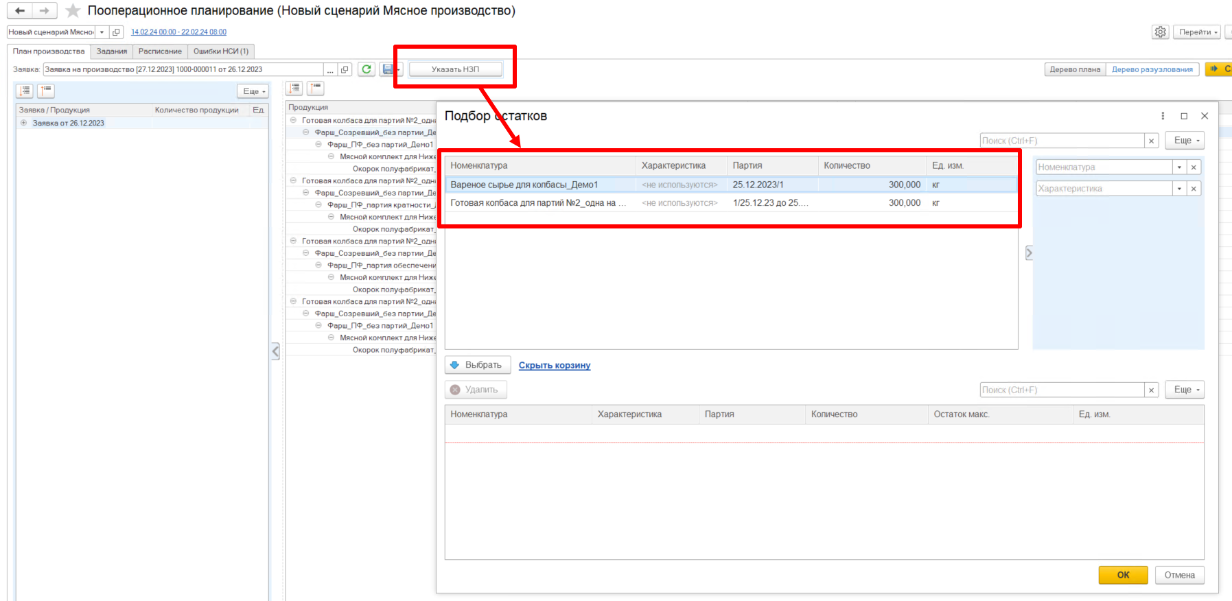 Например, выпустили мясной комплект на складе Комплектации, дальше этот мясной комплект должен использоваться при выпуске фарша на складе фаршеприготовления. Если оставить мясной комплект на складе комплектации, то на форме подбора НЗП не получится увидеть наш комплект, а если переместить его на склад фаршеприготовления, то он появится на форме подбора НЗП.