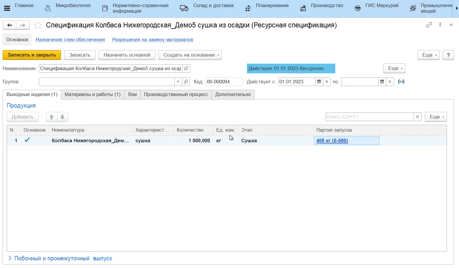Объем базового продукта в заявке = 1500 кг. Оптимальный объем запуска из спецификации = 1000 кг. При этом пользователь указывает НЗП базового продукта = 750 кг. Получается, с учетом НЗП по плану необходимо произвести еще 750 кг базового продукта, но т.к. оптимальный запуск = 1000 кг, то меньше 1000 кг произвести не получится. Будет выполнен запуск на 1000 кг и получится остаток от запуска, равный 250 кг. При этом на базовый продукт нужно было произвести 2000 кг, но из-за сокращения объема производства базового продукта, сократится и запуск полуфабриката.