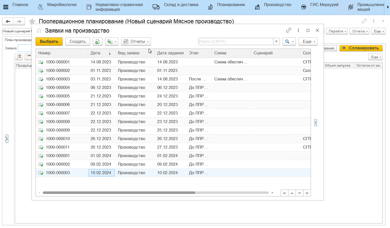 - в открывшейся форме выбрать партию полуфабриката, который нужно учесть при планировании и перенести в нижнюю табличную часть;