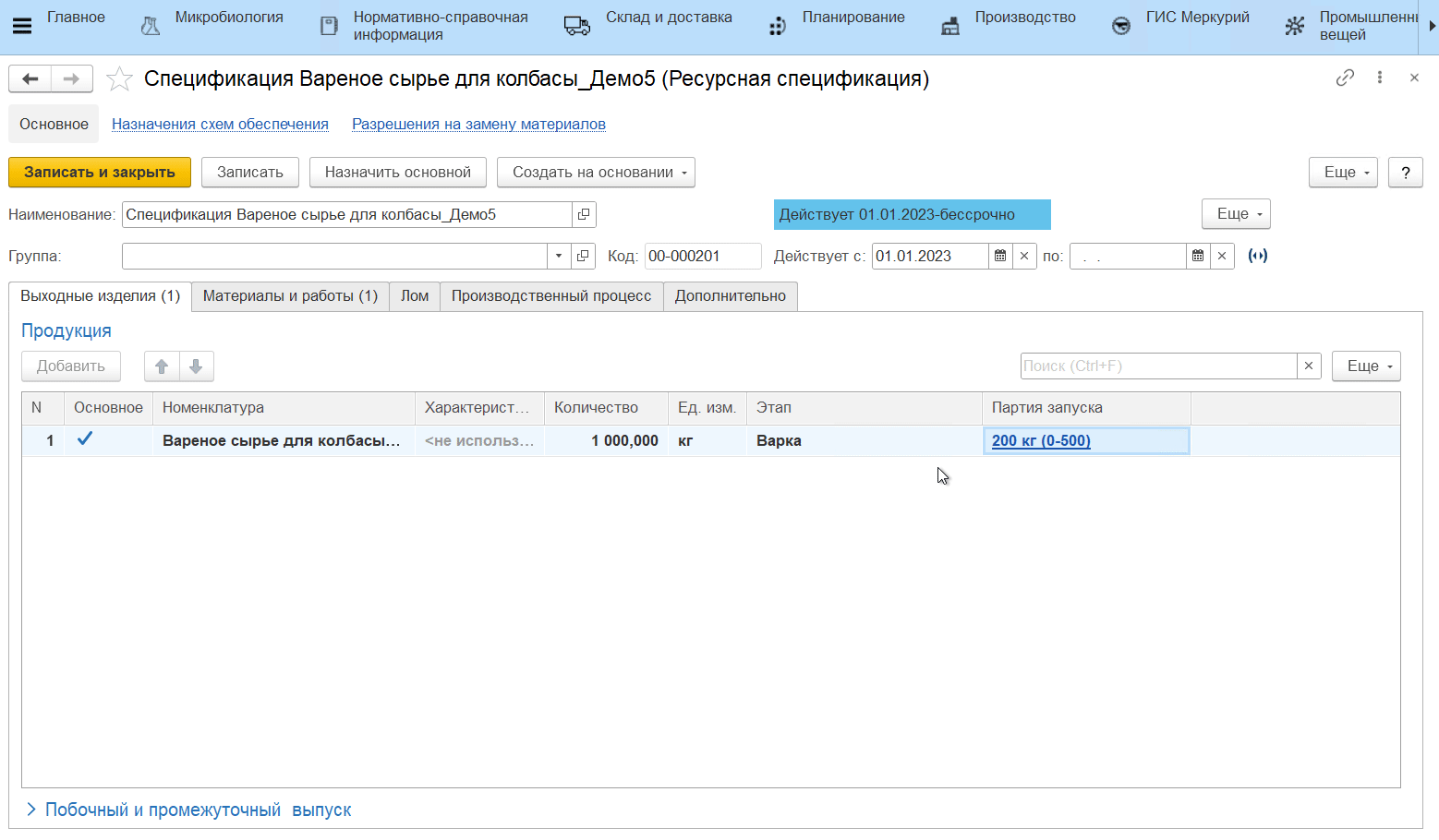 Объем полуфабриката в заявке = 1500 кг. Оптимальный объем запуска из спецификации = 1000 кг. При этом пользователь указывает НЗП полуфабриката = 750 кг. Получается, с учетом НЗП по плану необходимо произвести еще 750 кг полуфабриката, но т.к. оптимальный запуск = 1000 кг, то меньше 1000 кг произвести не получится. Таким образом, будет использовано 750 кг НЗП, будет выполнен запуск на 1000 кг, и получится остаток от запуска, равный 250 кг.
