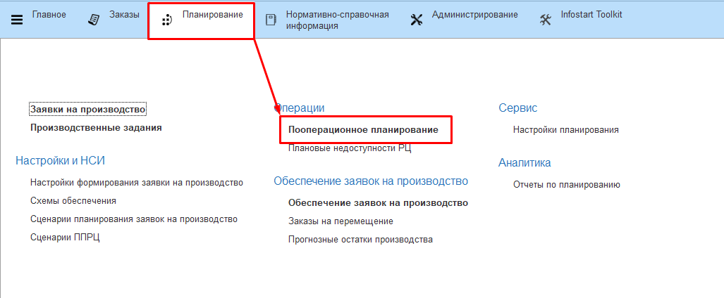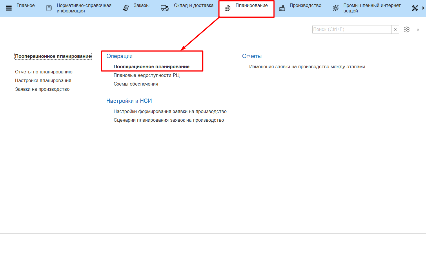 АРМ "Пооперационное планирование" располагается в разделе Планирование -> Операции.