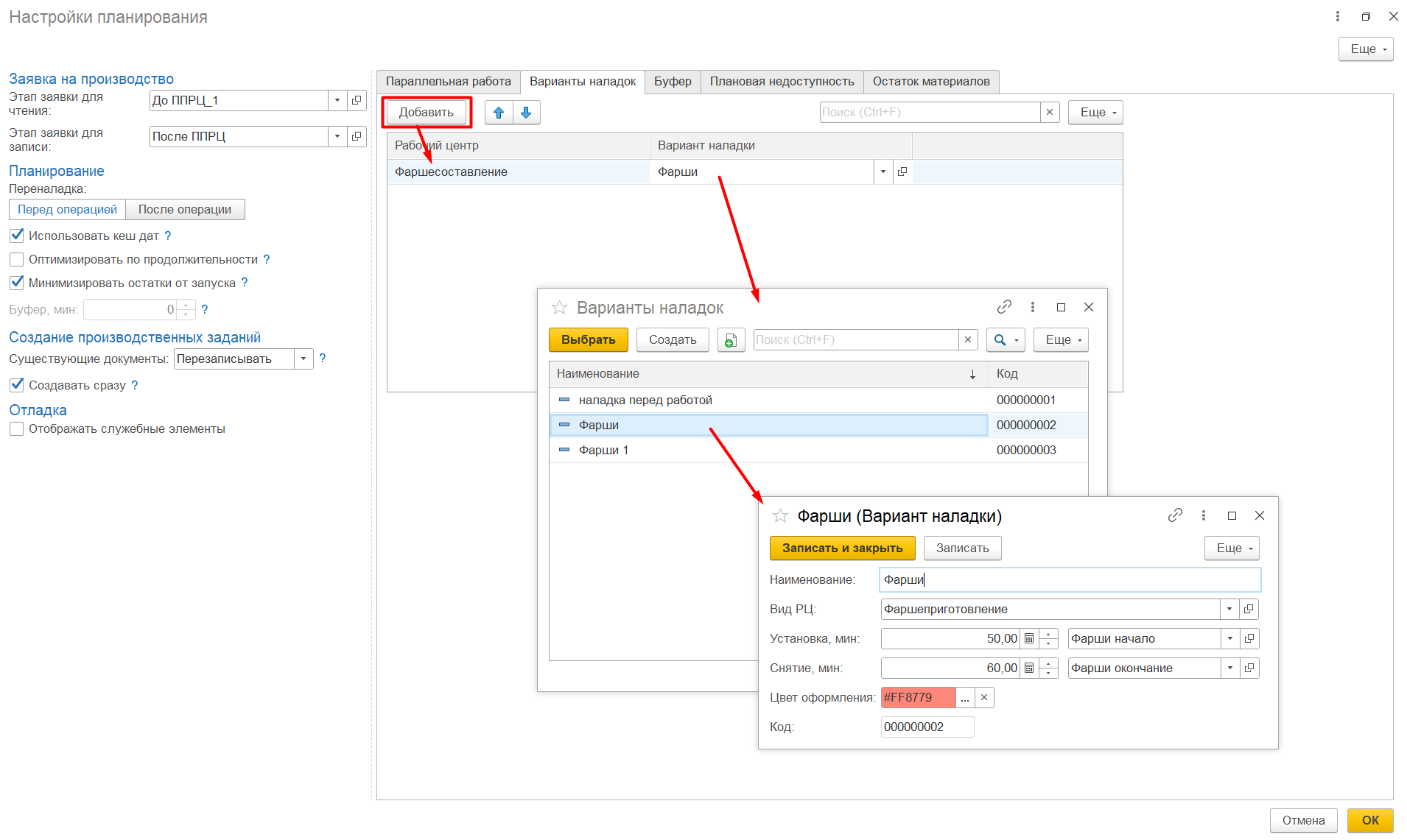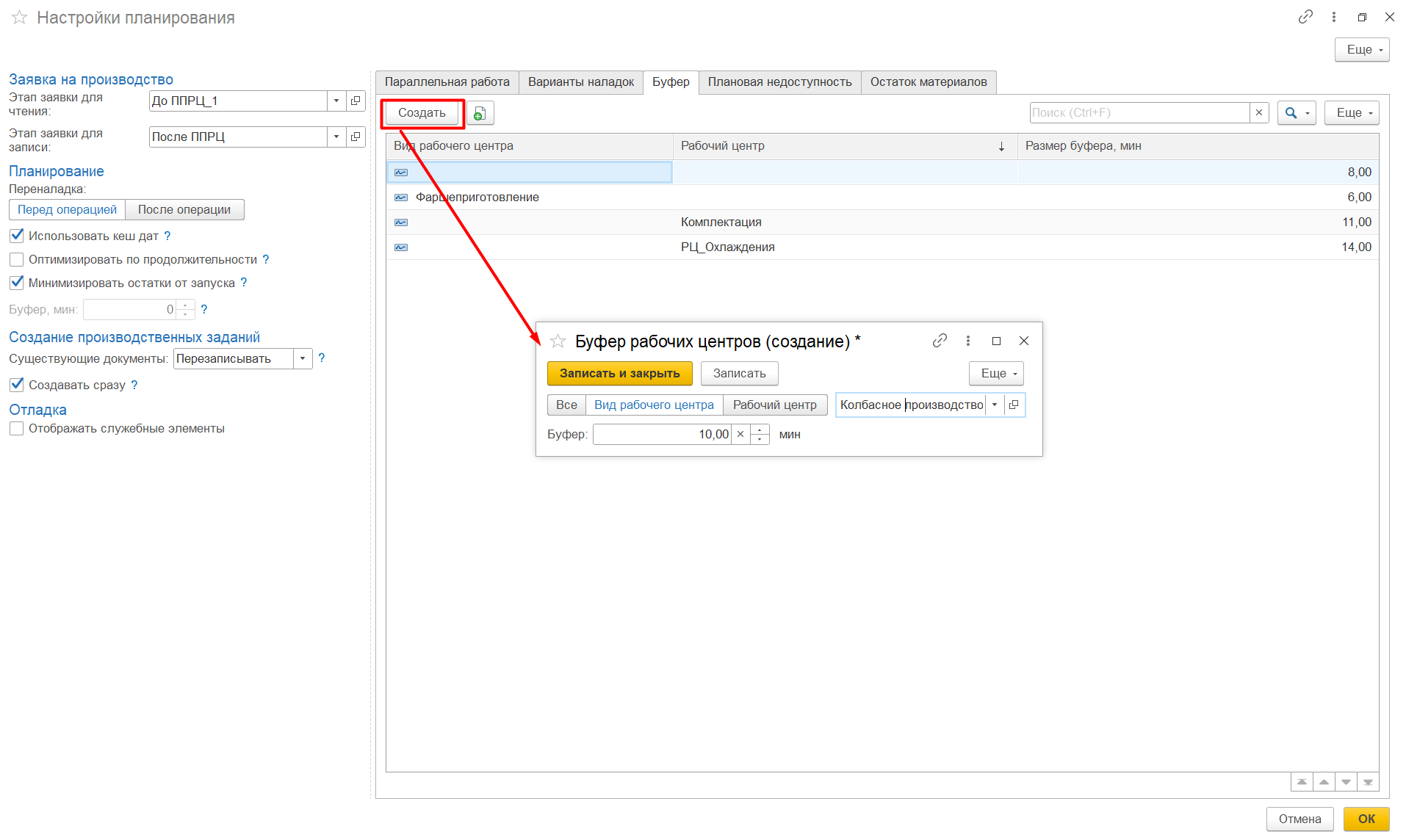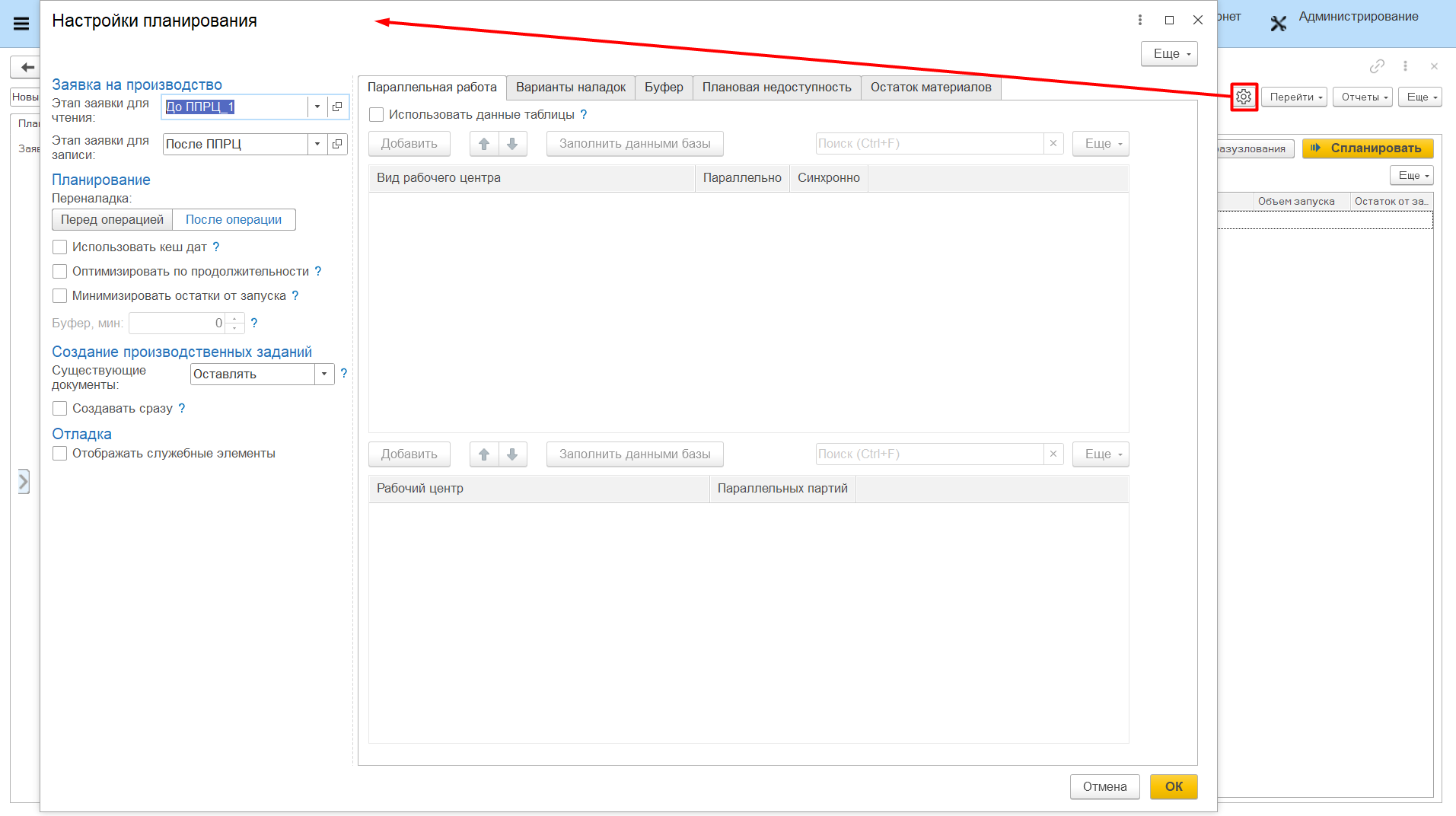- заполнить настройки планирования - по умолчанию настройки дублируют настройки из сценария ППРЦ, но сценарий - универсальный шаблон, а на практике ситуация на предприятии может меняться каждый день. Поэтому сценарий остается неизменным, но его можно скорректировать с помощью настроек.