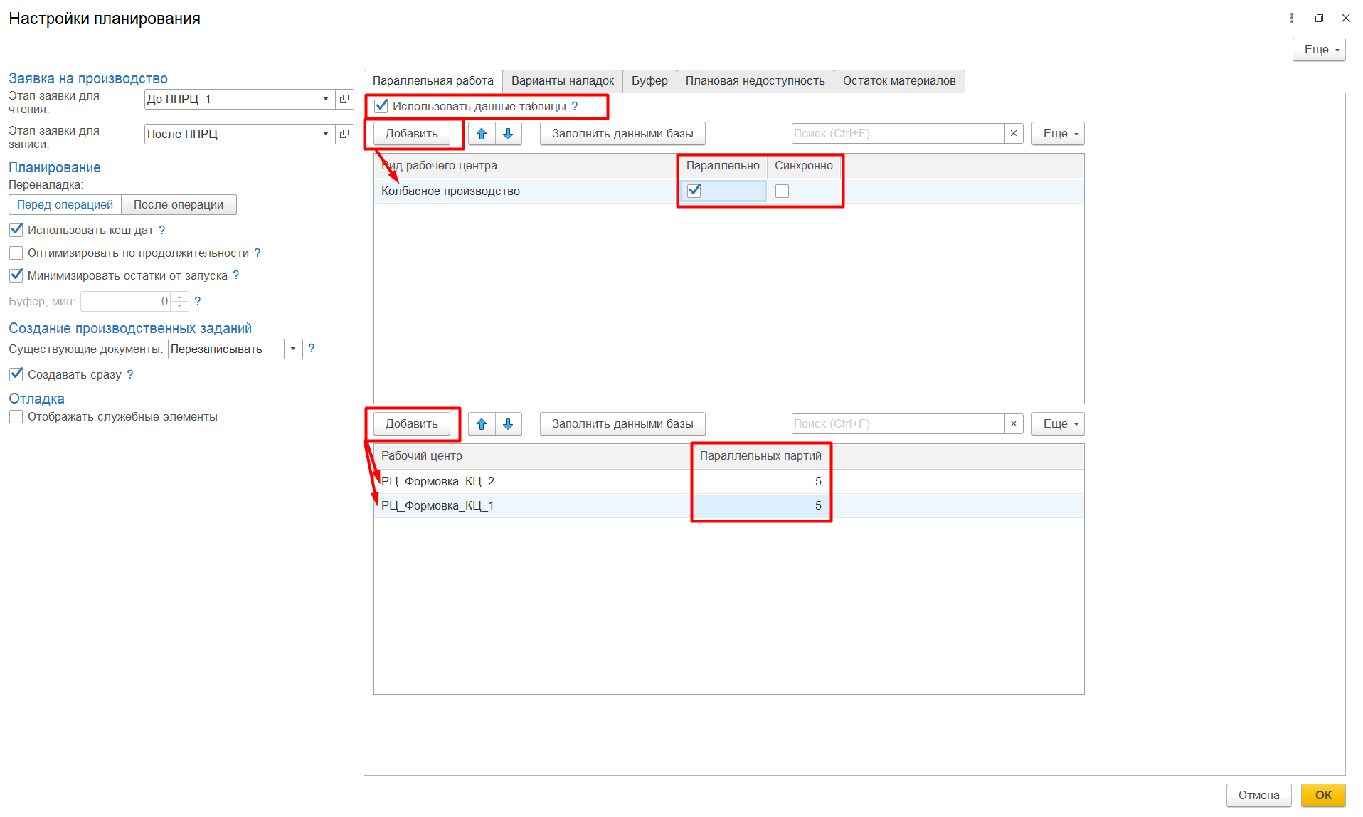 Настройки параллельной работы рабочих центров - если используются данные этой таблицы, то данные о параллельности из настроек вида рабочего центра и сценария игнорируются;