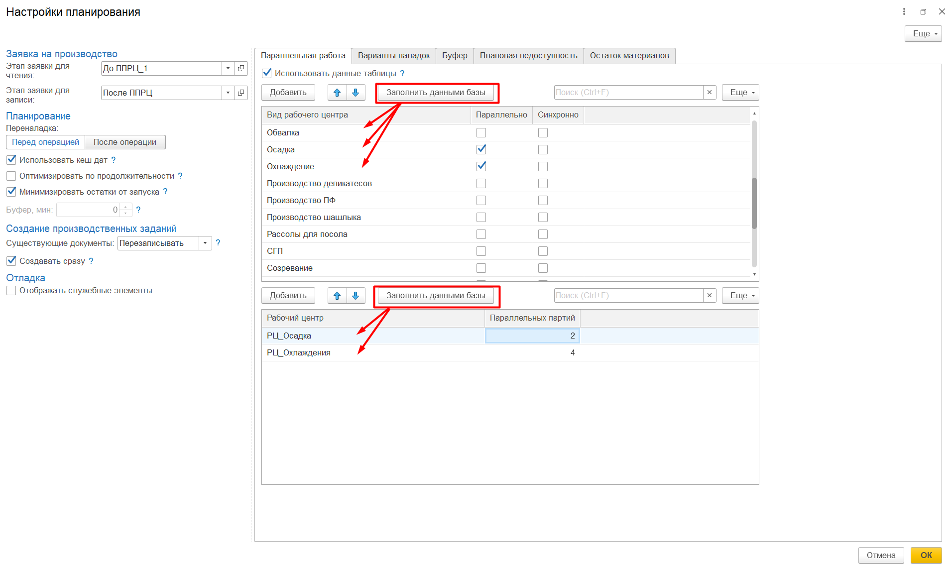 - по нажатию кнопки "Заполнить данными базы" таблица обновляется данными о параллельной работе по всем доступным в системе видам рабочих центров, эту информацию так же можно редактировать.