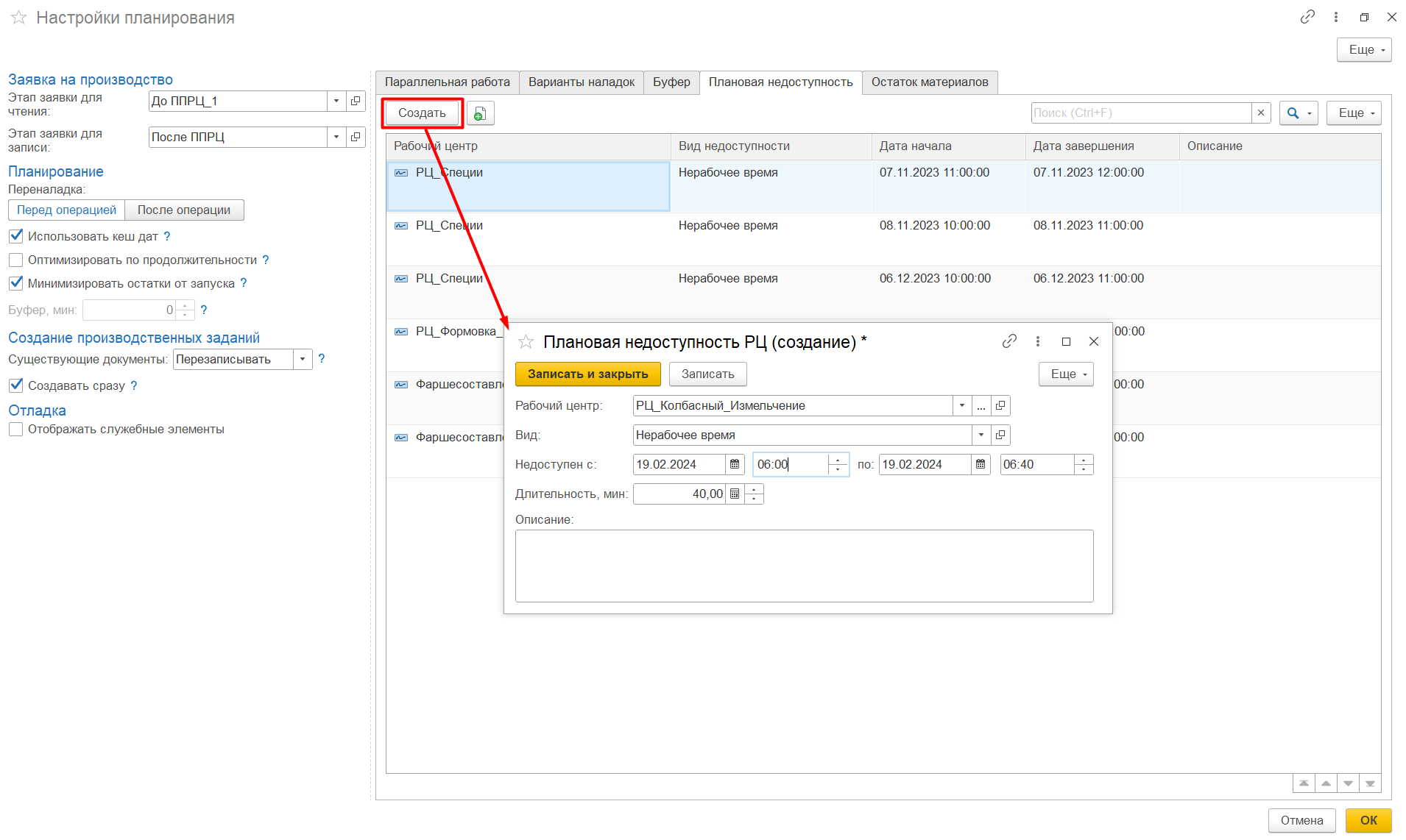 - Плановая недоступность - в расписание добавляется нерабочее время (или другой вид недоступности) для рабочего центра, планирование ведется с учетом указанных в табличной части недоступностей.
