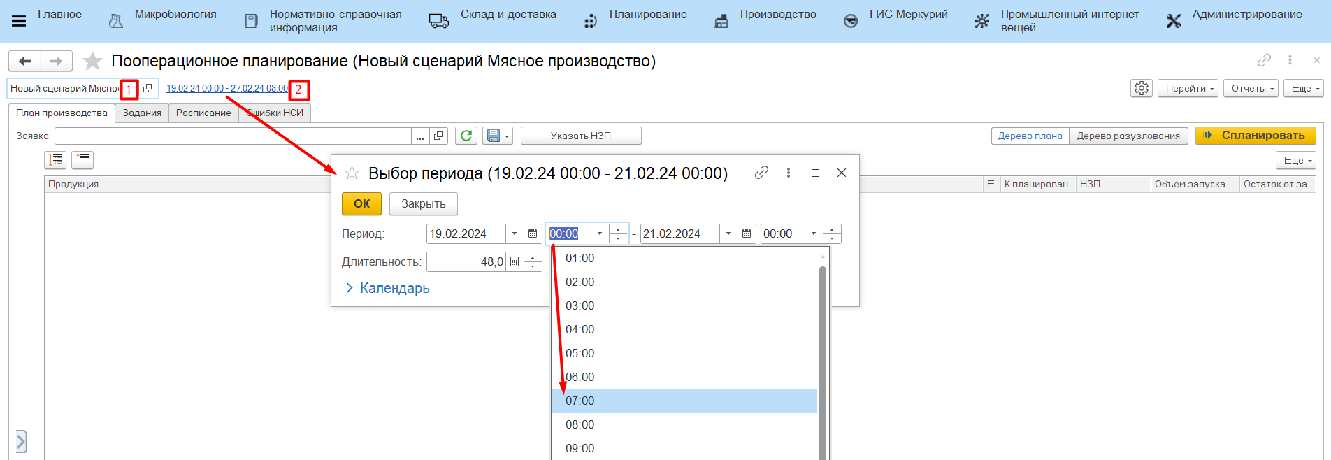 - указать период планирования - по умолчанию период заполняется из настроек сценария, но при необходимости его можно отредактировать с точностью до часов. Например, предприятие работает с 7 часов утра, а период планирования задан с 00:00 часов. Нет смысла рассматривать 7 нерабочих часов в расписании, поэтому период планирования можно подвинуть на 07:00. Так же можно поступить с окончанием периода;