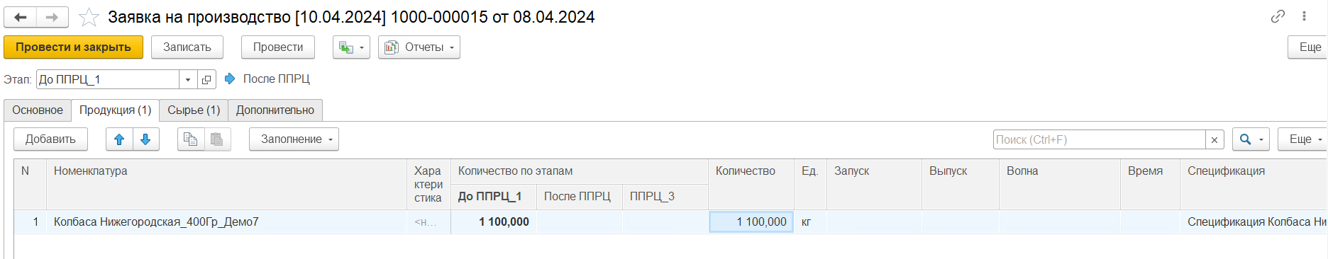 Рассмотрим процесс формирования расписания на основании заявки с одной позицией. Нам необходимо произвести колбасу Нижегородскую 400гр. - 1100 кг. Соответственно, на входе имеем такую заявку