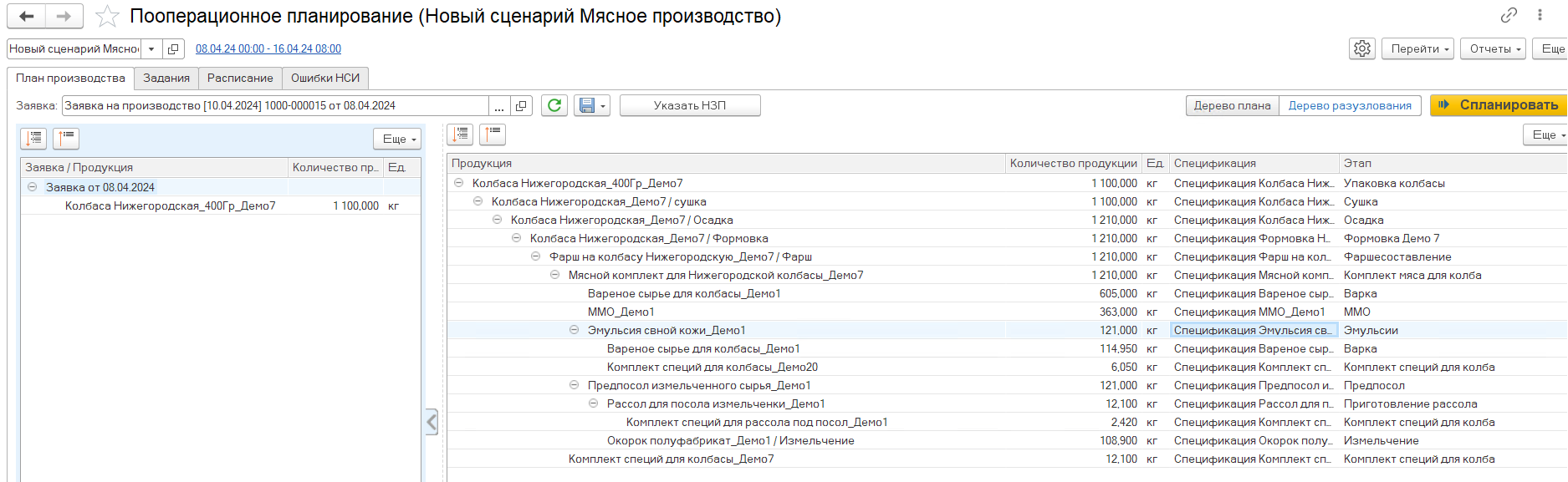 В Результате в дереве разузлования будут отражаться только те переделы, которые производятся на виде рабочего центра "Колбасное производство", а в дереве плана будет отображаться только та продукция, которая выпускается на выбранном цехе/подразделении.