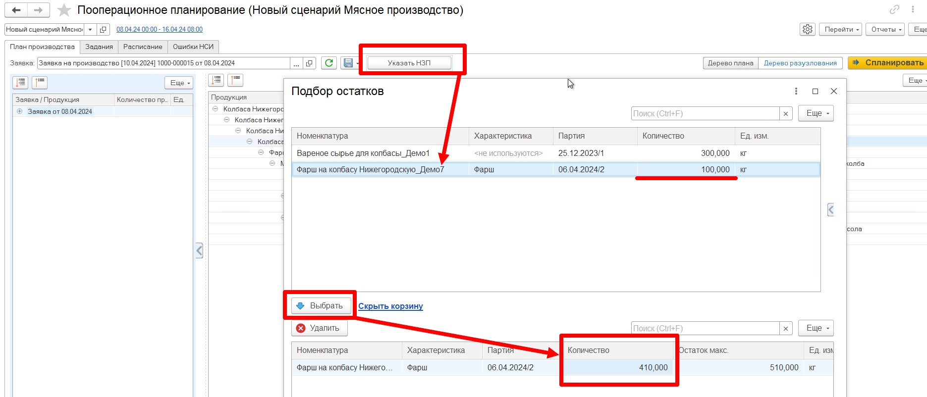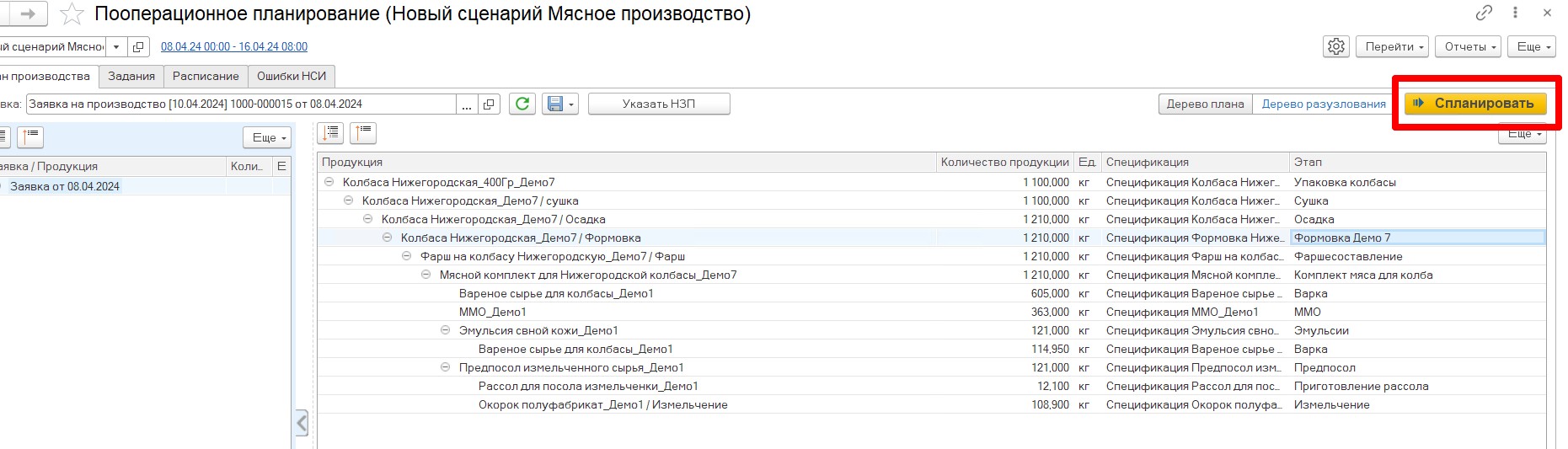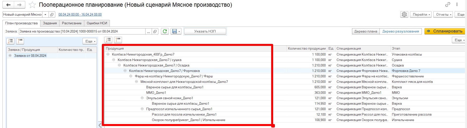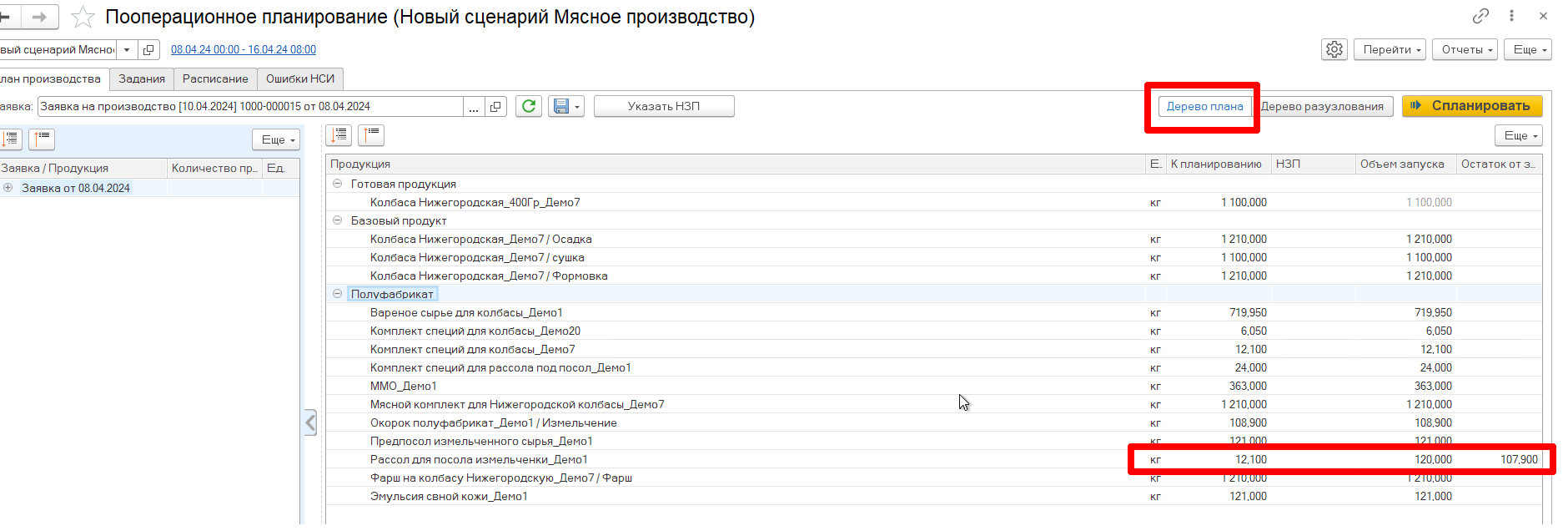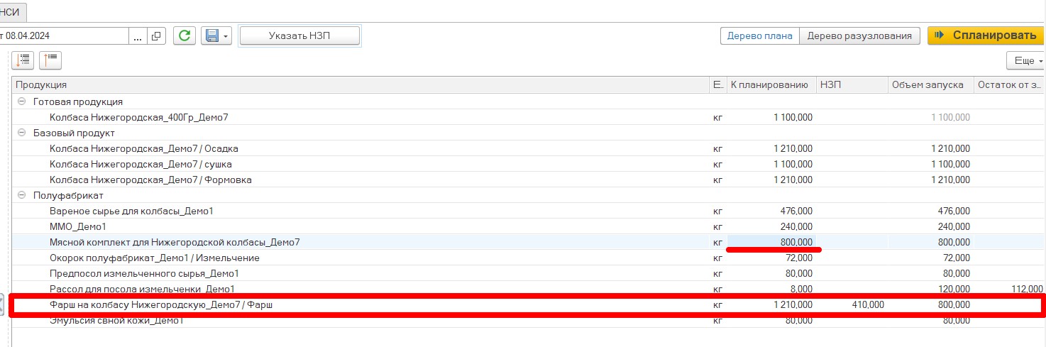 В результате в дереве плана пересчитывается "объем запуска" для самого фарша, как "К планированию" - "НЗП", также пересчитывается необходимое количество всех материалов ниже по производственной цепочке: количество мясного комплекта и количество полуфабрикатов, из которых этот мясной комплект собирается: эмульсия, вареное сырье, ММО, предпосоленное сырье.