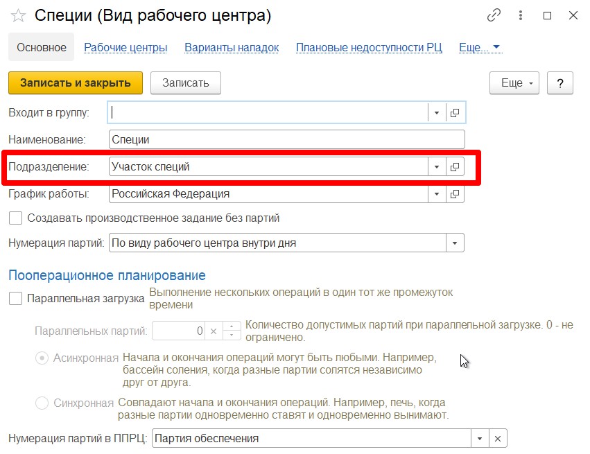Для этого необходимо в виде рабочего центра указать подразделение - цех, к которому относится данный вид рабочего центра.
