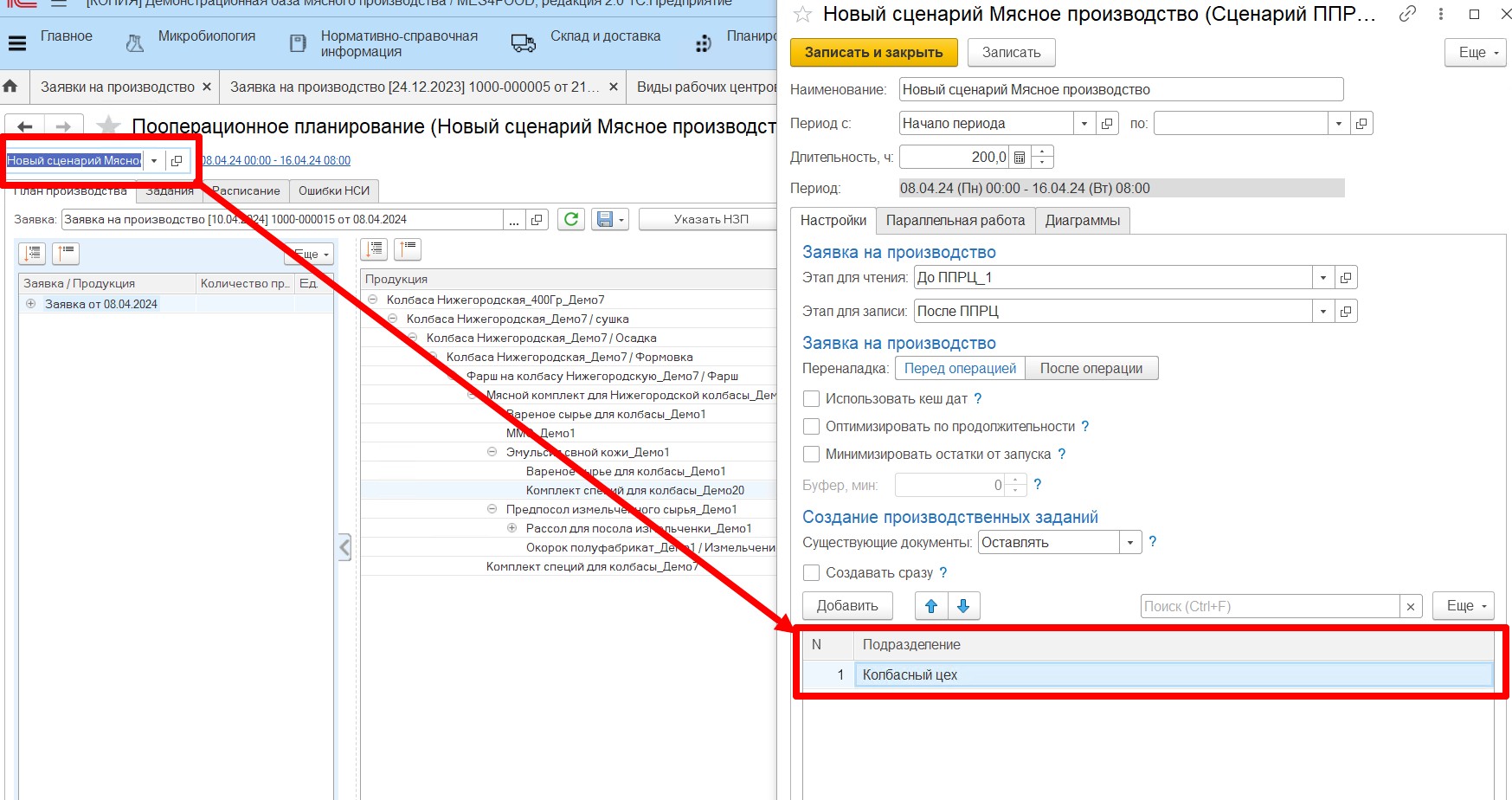 Для того, чтобы ограничить разузлование только по подразделению "Колбасное производство", необходимо в сценарии планирования задать подразделение, которое нужно распланировать. (Подробнее о настройках сценария планирования в разделе Сценарий планирования)