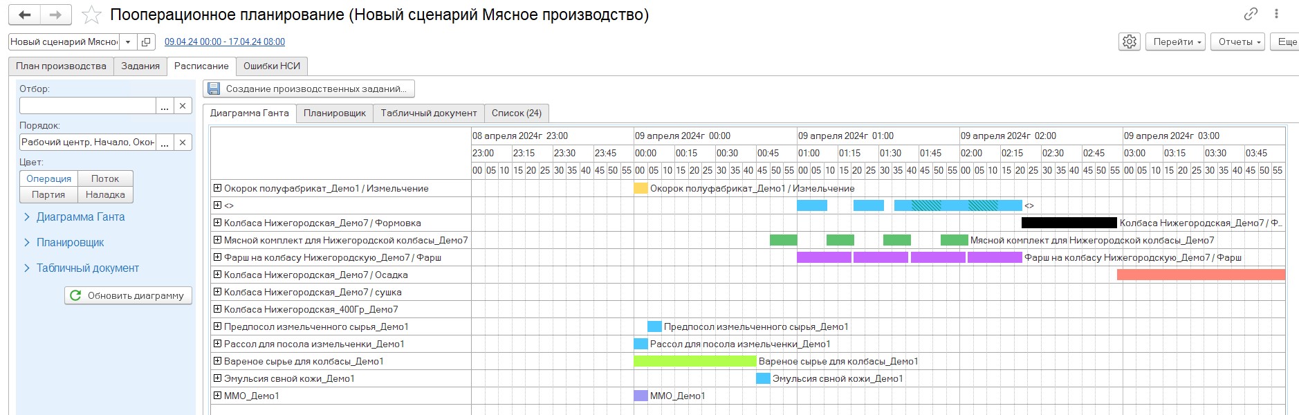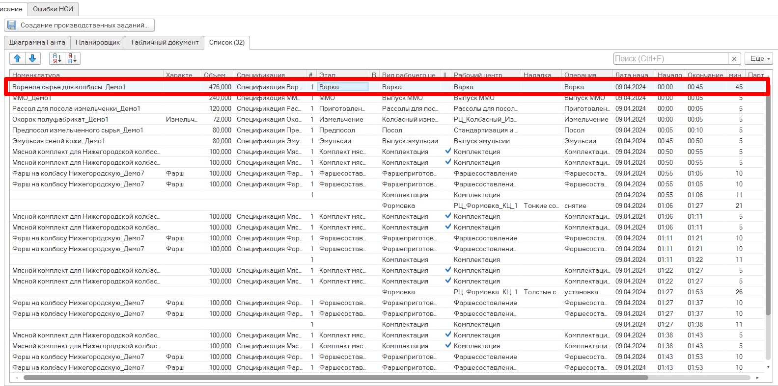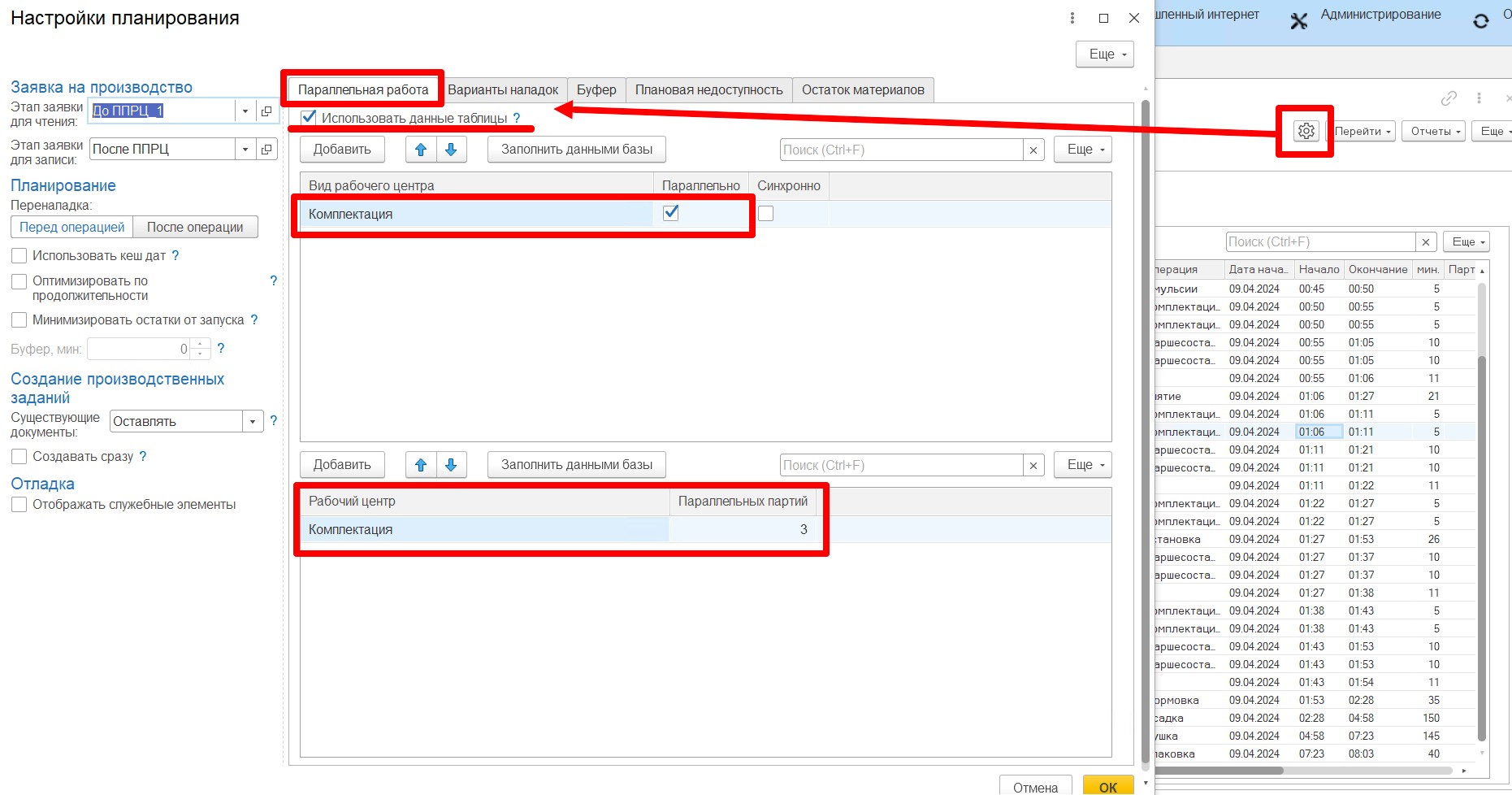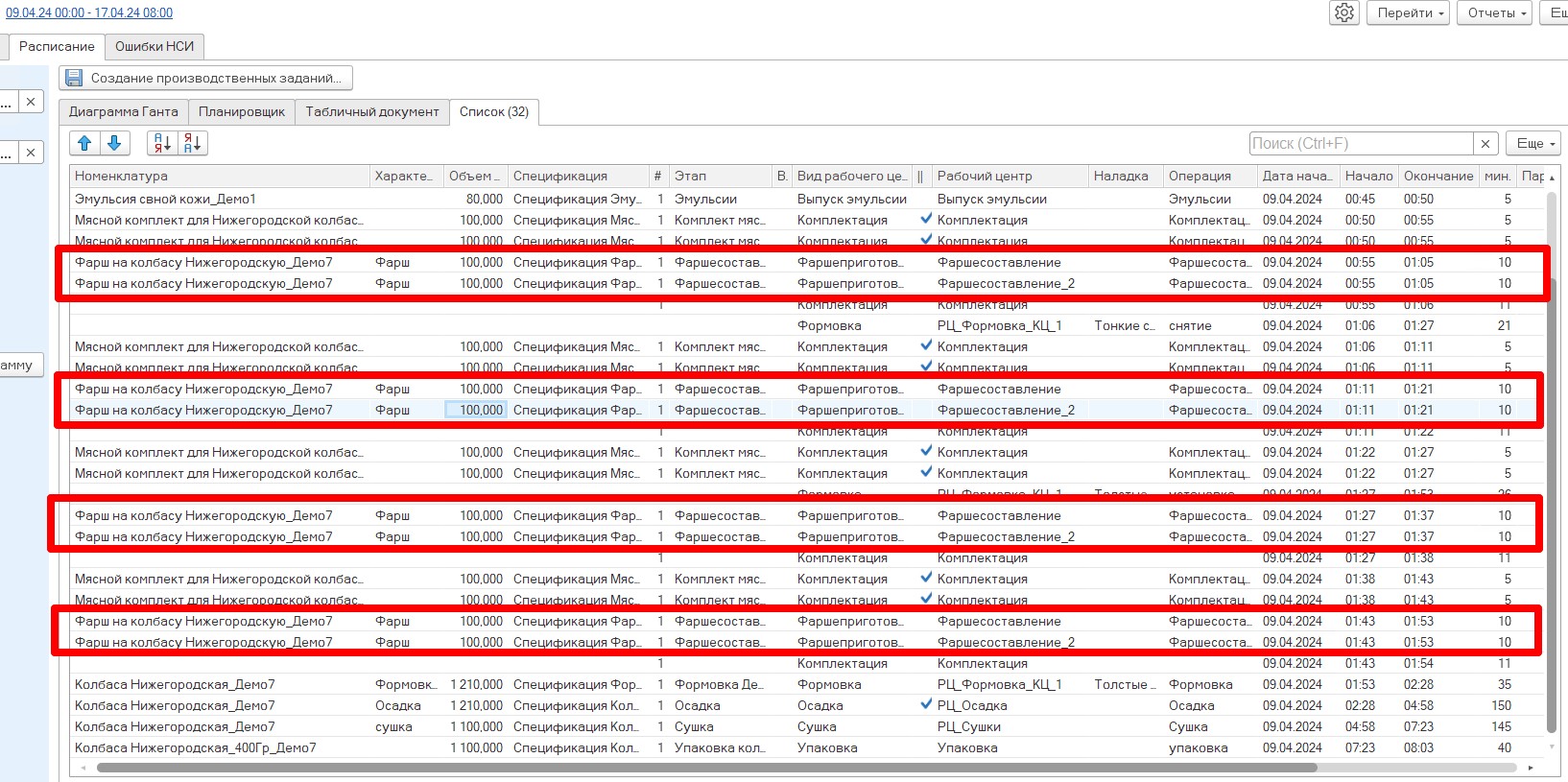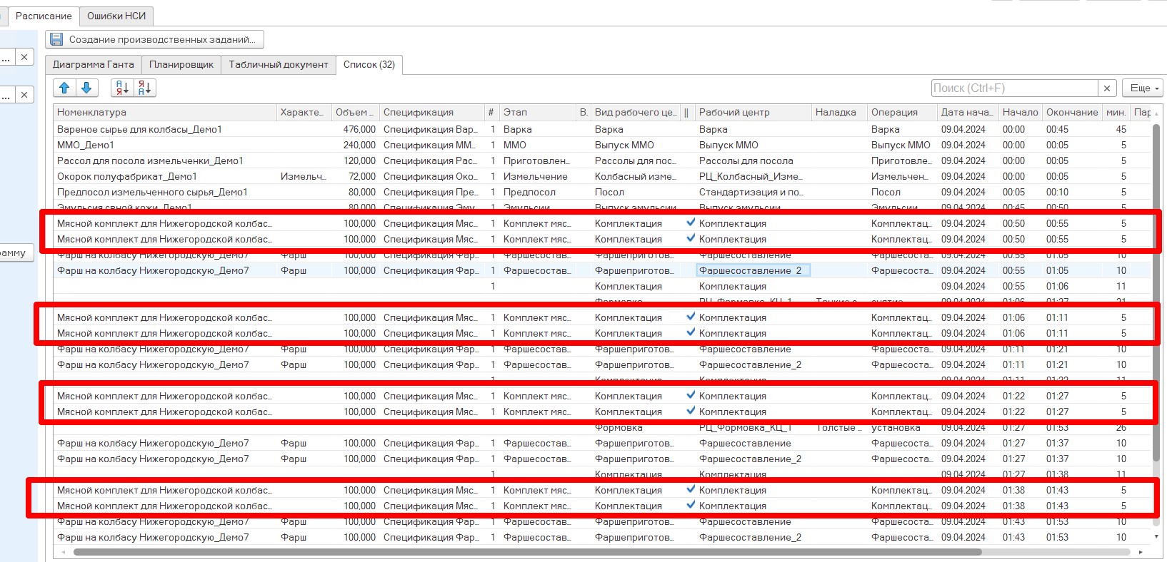 В настройках была задана параллельность для вида рабочего центра "Комплектация", система это учитывает и в расписании видно, что мясные комплекты запускаются одновременно по несколько замесов.
