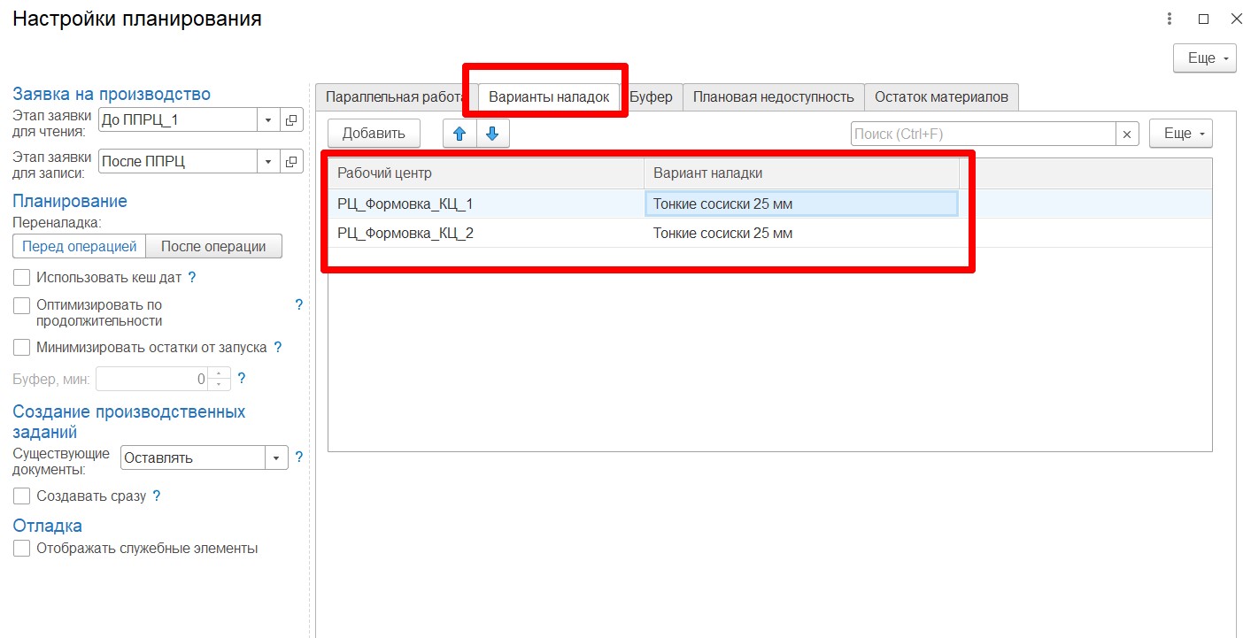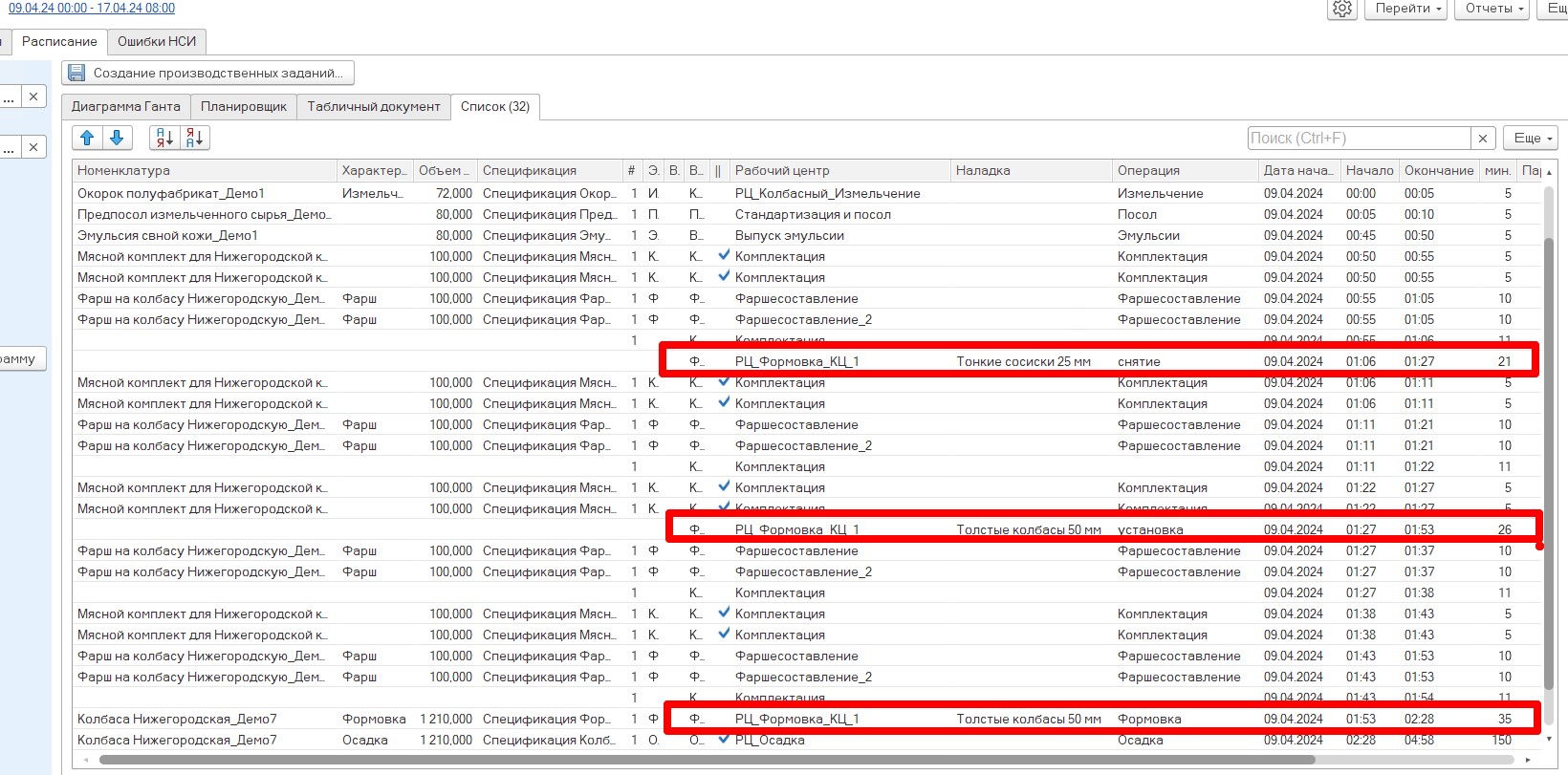 Так как для формовочного оборудования была задана начальная наладка, и в этапе формовки задана необходимая наладка для выпуска сформованного продукта, то в расписании было заложено время на снятие старой наладки и установку новой наладки. Только после этого идет операция формовки колбасы.
