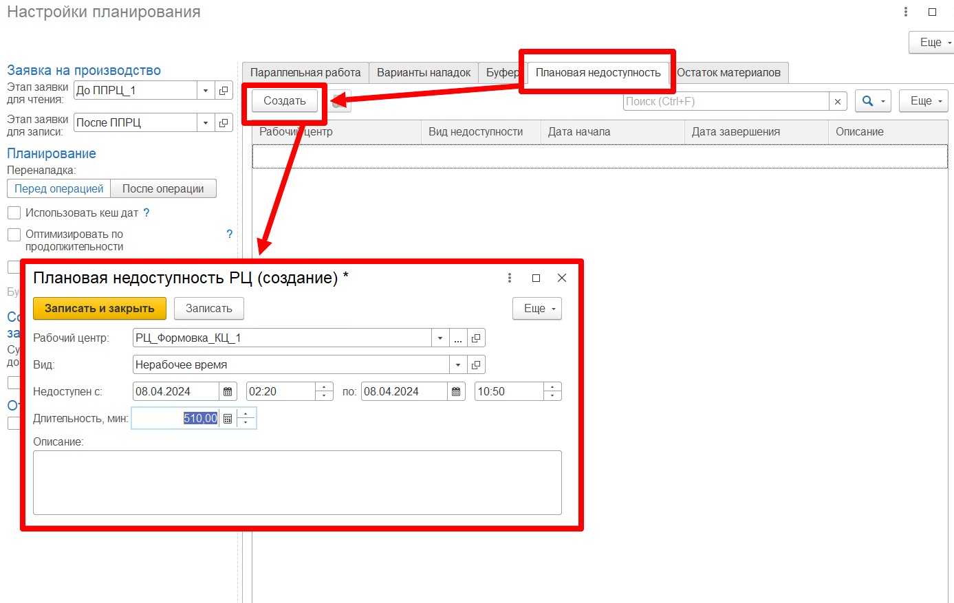 Необходимо указать рабочие центры, которые будут недоступны и время их недоступности для того, чтобы система не планировала их загрузку.