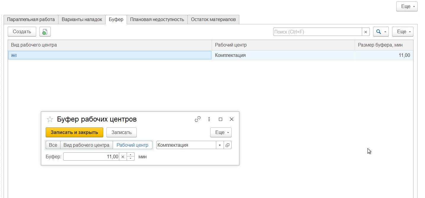 В системе есть возможность заложить буфер между операциями - время, которое добавляется в промежутках между запусками на одном рабочем центре. Его можно привязать как к конкретному рабочему центру, так и к виду рабочего центра. (Подробнее о настройках АРМа ППРЦ в разделе Настройки АРМа ППРЦ)