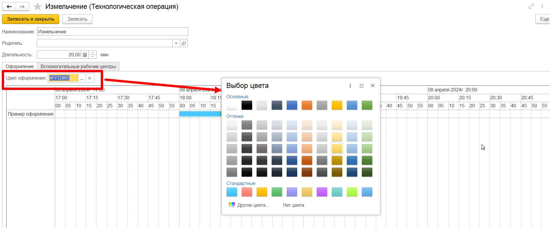 Временной интервал каждой операции можно окрасить в свой цвет. Для этого в справочнике "Технологическая операции" необходимо задать её цвет.