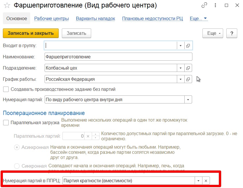 Зафиксировали, что для вида рабочего центра "Комплектация" будет параллельная загрузка некоторого рабочего центра. В таблице ниже необходимо указать, какой именно рабочий центр будет параллельно загружать партии, и сколько партий одновременно он сможет производить.
