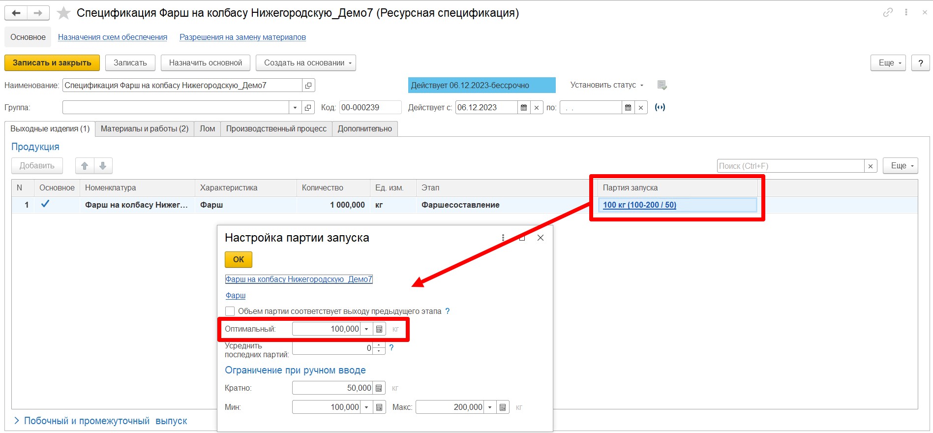 Для фарша задан вариант: "Партия кратности". В этом случае общий объем необходимого полуфабриката разбивается на замесы, равные оптимальной партии. Оптимальная партия настраивается в ресурсной спецификации. (Подробнее в разделе Ресурсные спецификации)