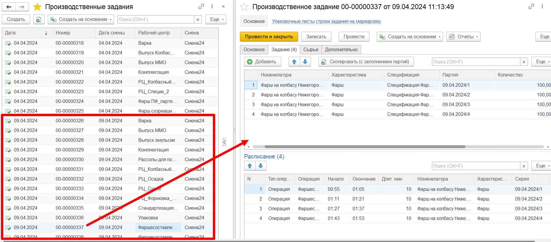 По кнопке "Создание производственных заданий" сформируется несколько документов с заполненными вкладками "Задание" и "Расписание" - на каждый рабочий центр свой документ. (Подробнее в разделе Создание производственных заданий)