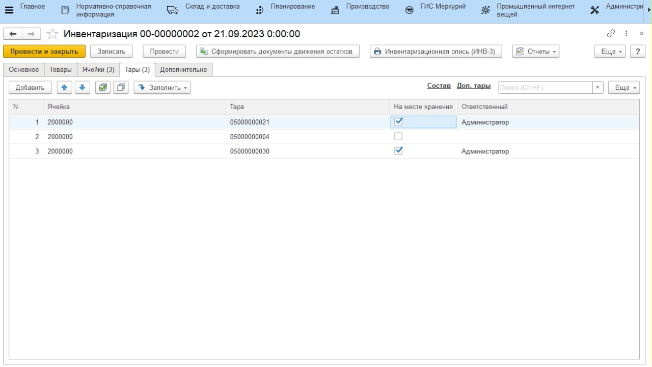 Инвентаризация на складе с учетом тар более подробно описана в разделе "Пересчет и Инвентаризация продукции с указанием тары".