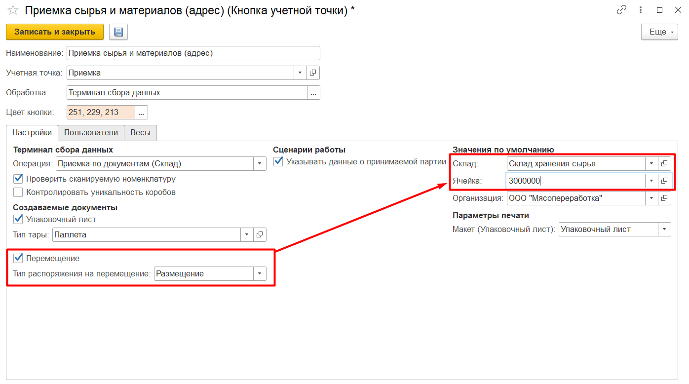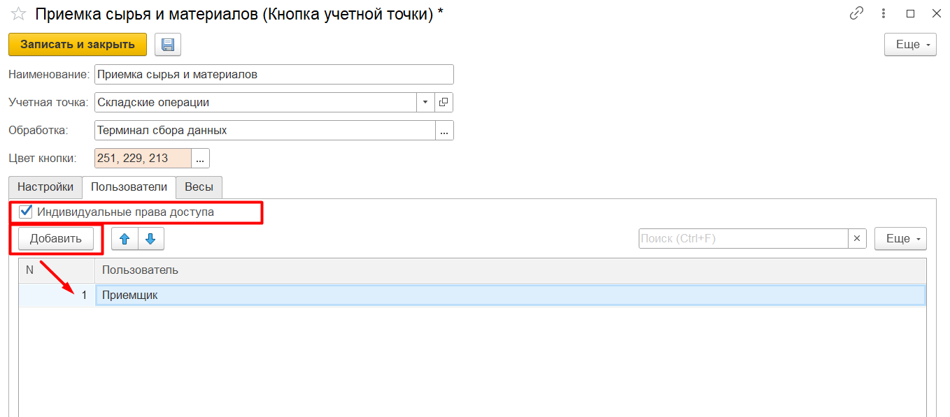 Создание и настройка кнопки "Приемка сырья и материалов"