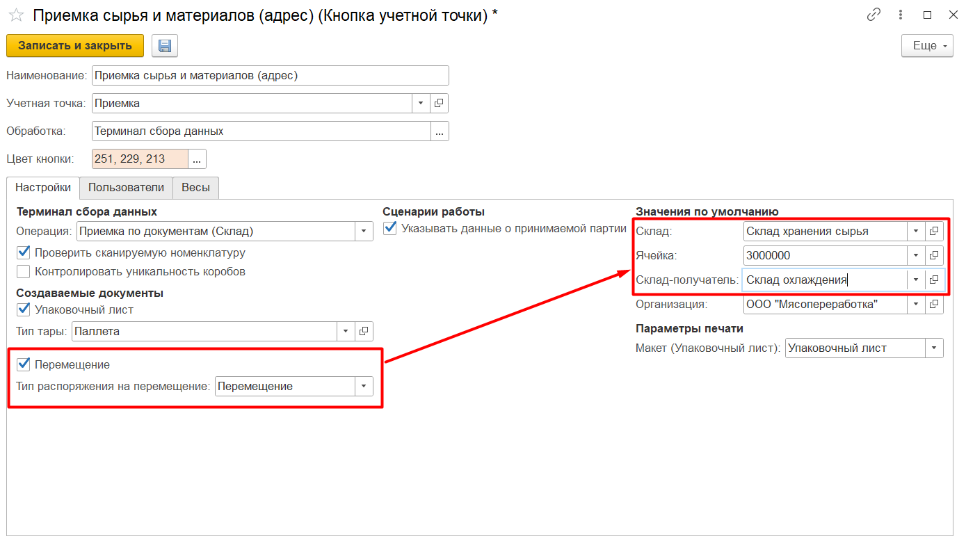 Перемещение - если выбрана, по итогу приемки для каждой принятой паллеты будет сформирован документ "Распоряжение на перемещение" с типом "Перемещение":