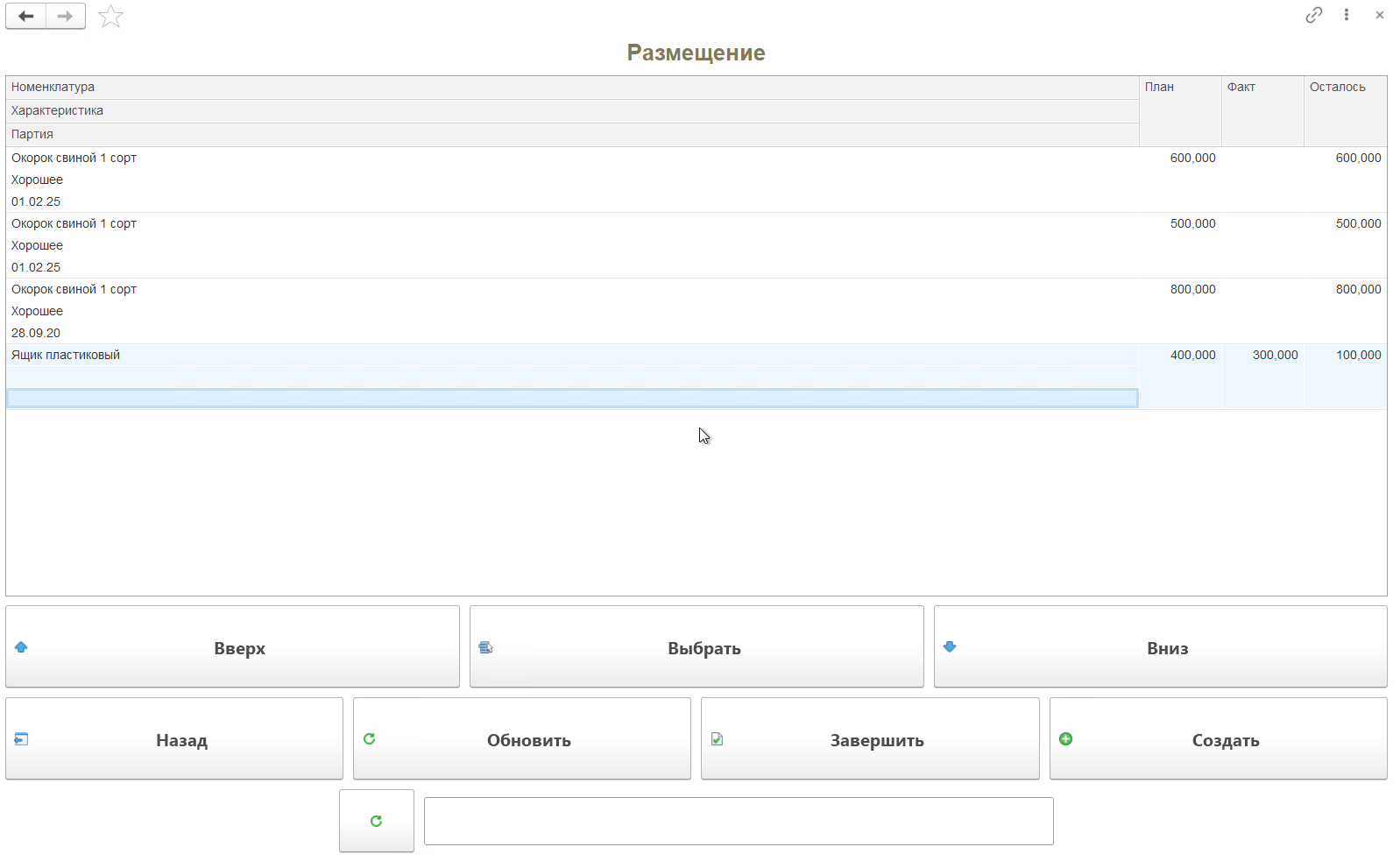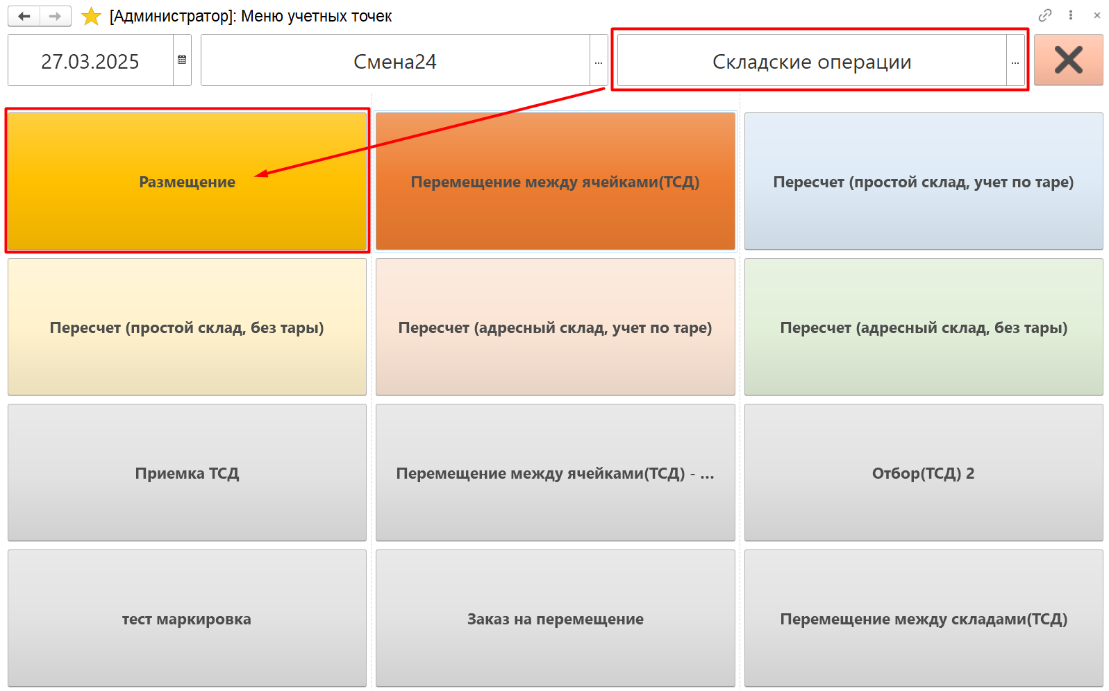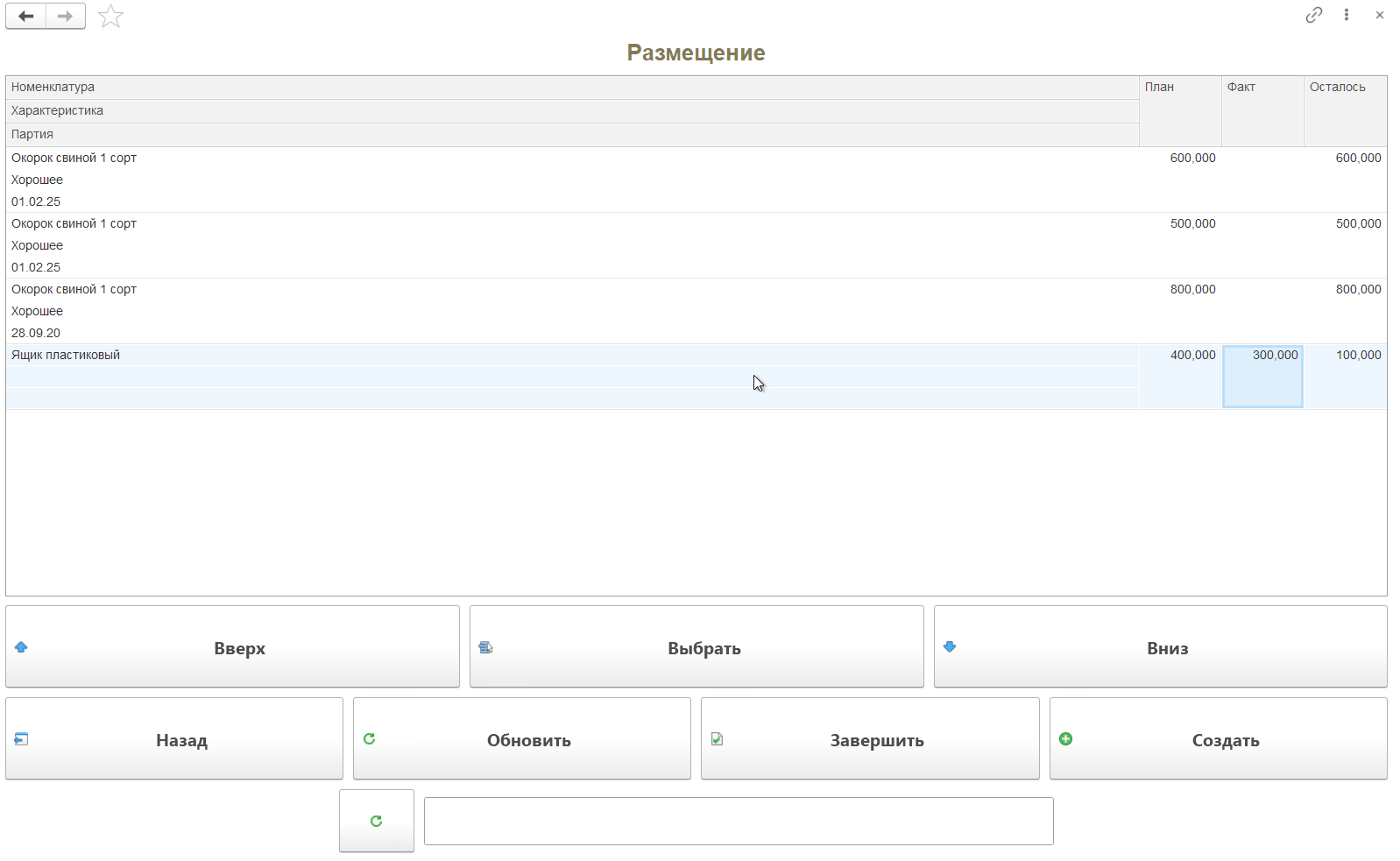 Кнопка "Размещение" используется только на складах с адресной системой хранения. Применяется для перемещения продукции из ячейки приемки в ячейку хранения.