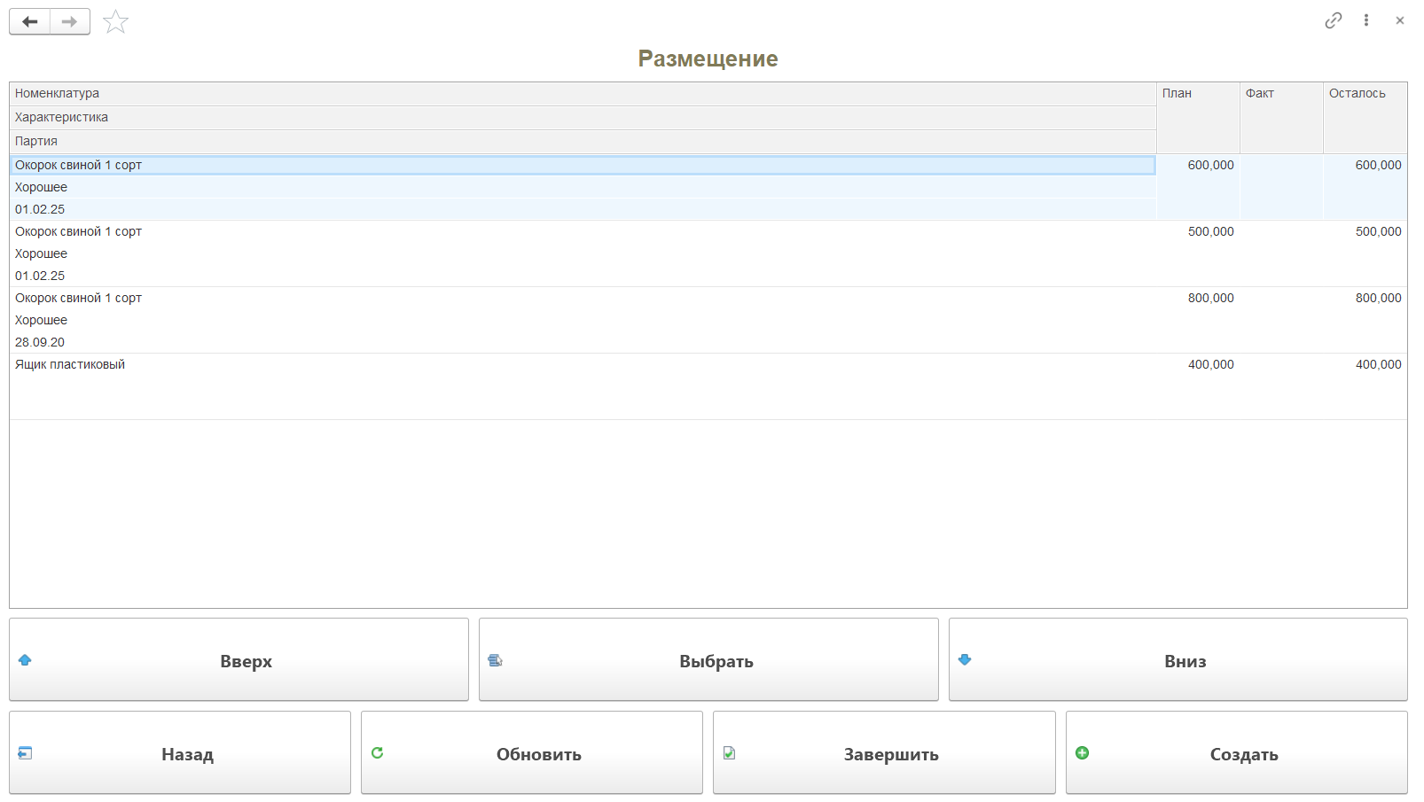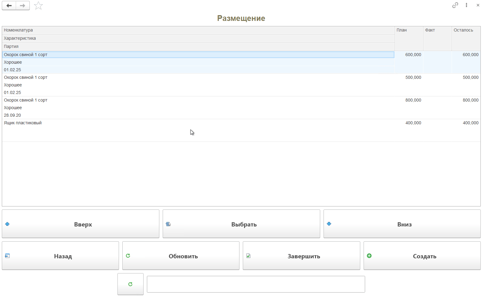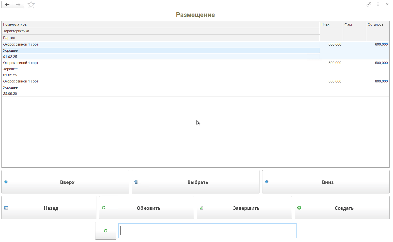 Кнопка "Размещение" используется только на складах с адресной системой хранения. Применяется для перемещения продукции из ячейки приемки в ячейку хранения.