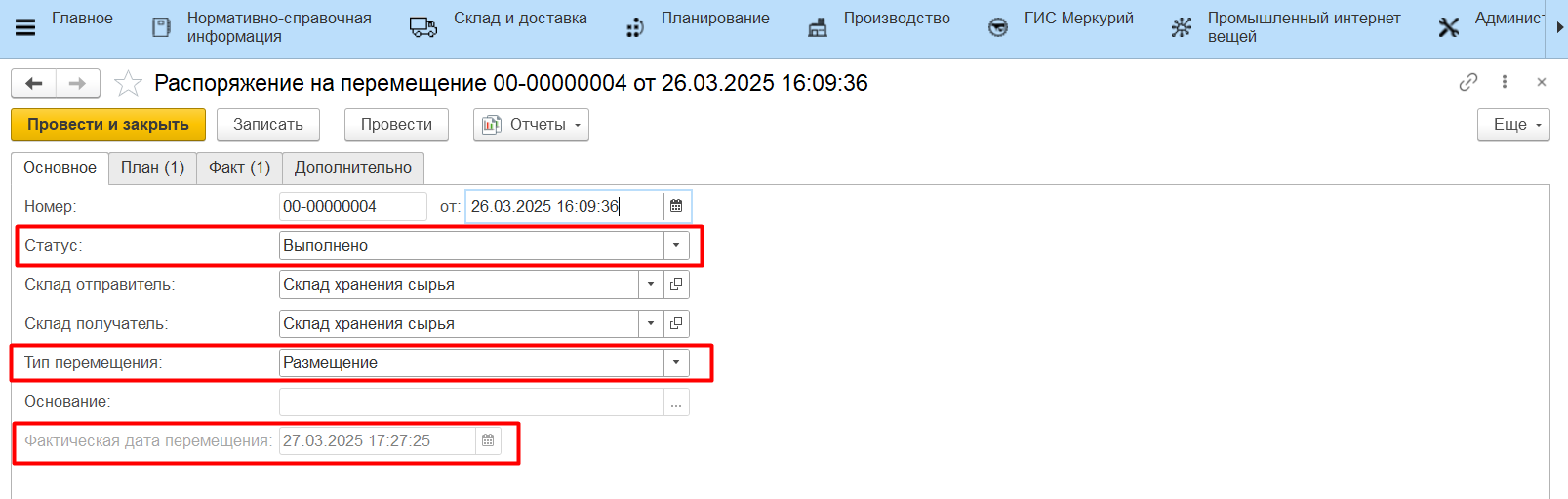 Чтобы закончить выполнение перемещения, нажать "V". Тогда документ "Распоряжение на перемещение" будет заполнен, переведен в статус "Выполнено" и уйдет из списка.
