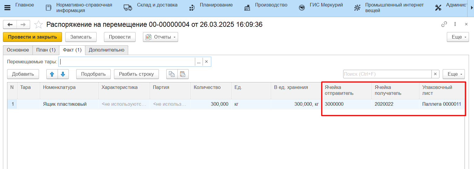 - В открывшейся форме указать ячейку-получатель продукции;