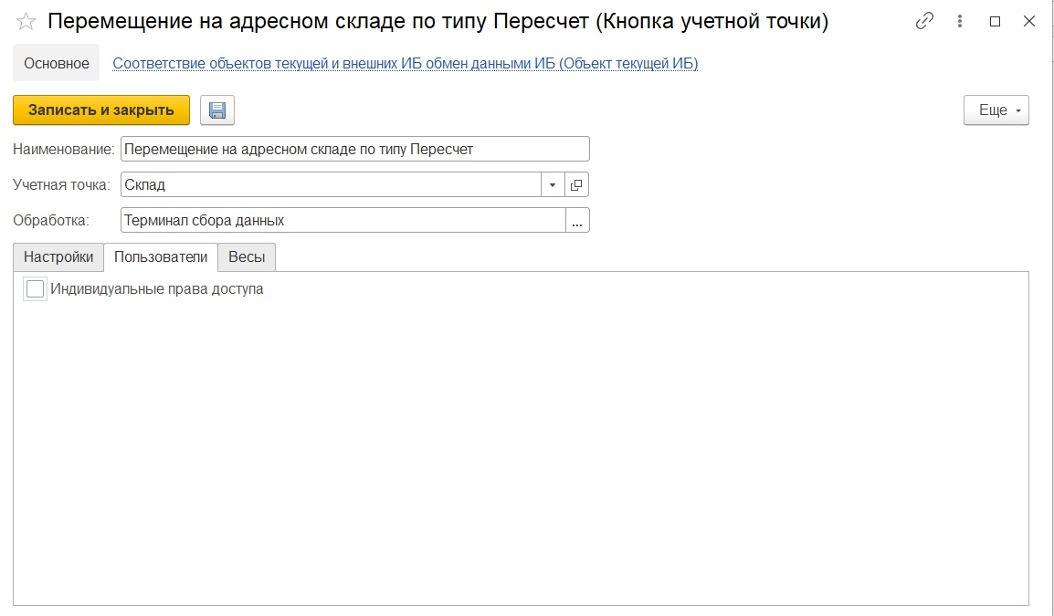 При создании кнопки учетной точки "Перемещение на адресном складе по типу Пересчет" указываются: