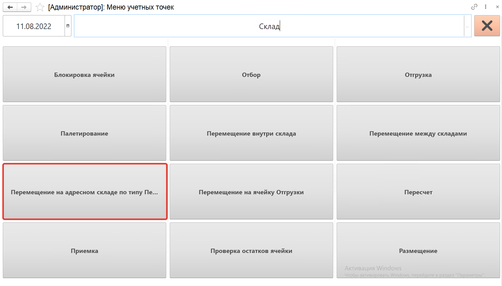 На форме обработки появятся кнопки выбранной учетной точки, выбираем кнопку "Перемещение на адресном складе по типу Пересчет".