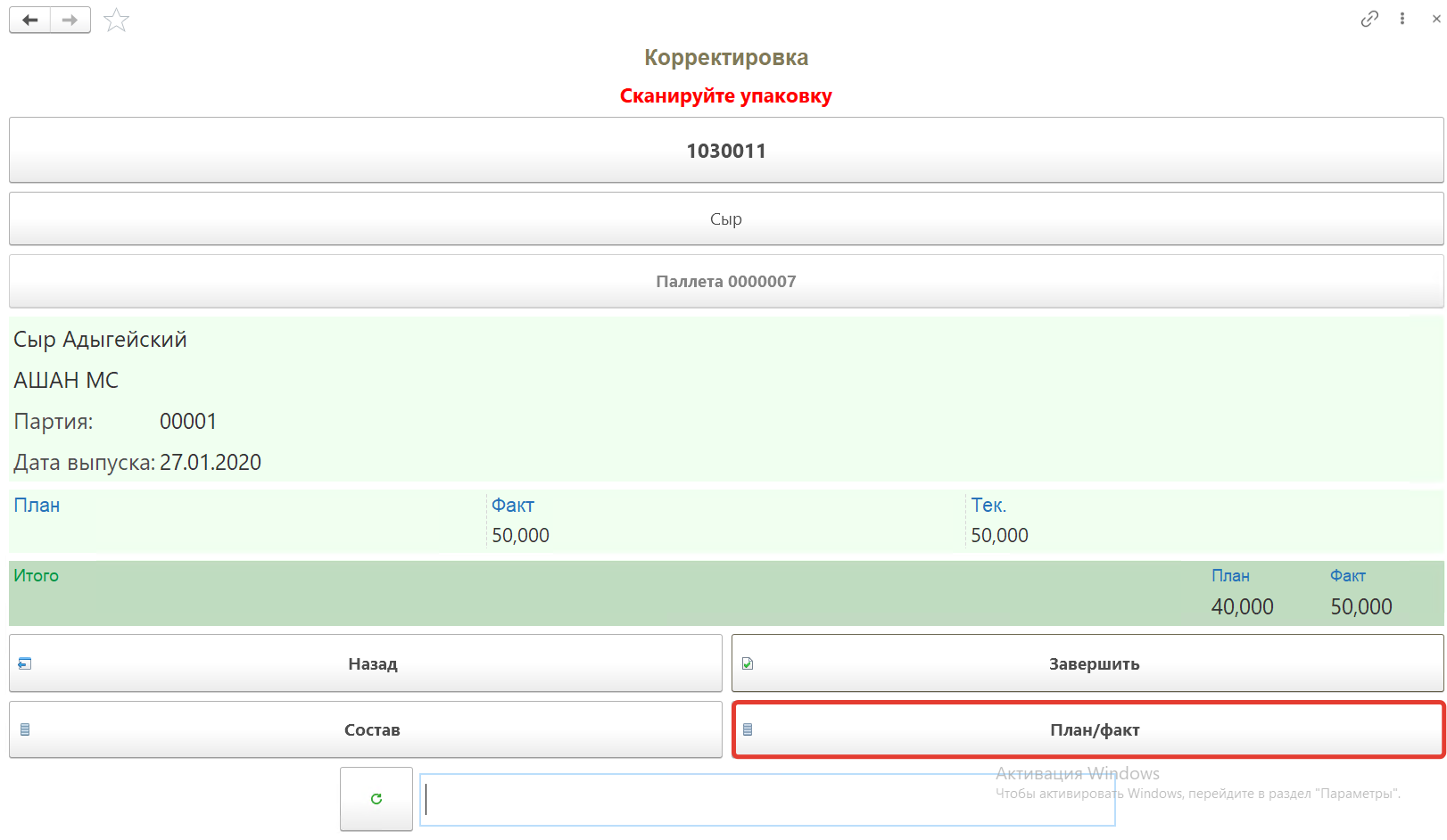 Далее сканируем штрихкоды паллет расположенных в этой ячейке, номенклатура появится на форме. Появится количество фактически отсканированного товара по плану и по факту.