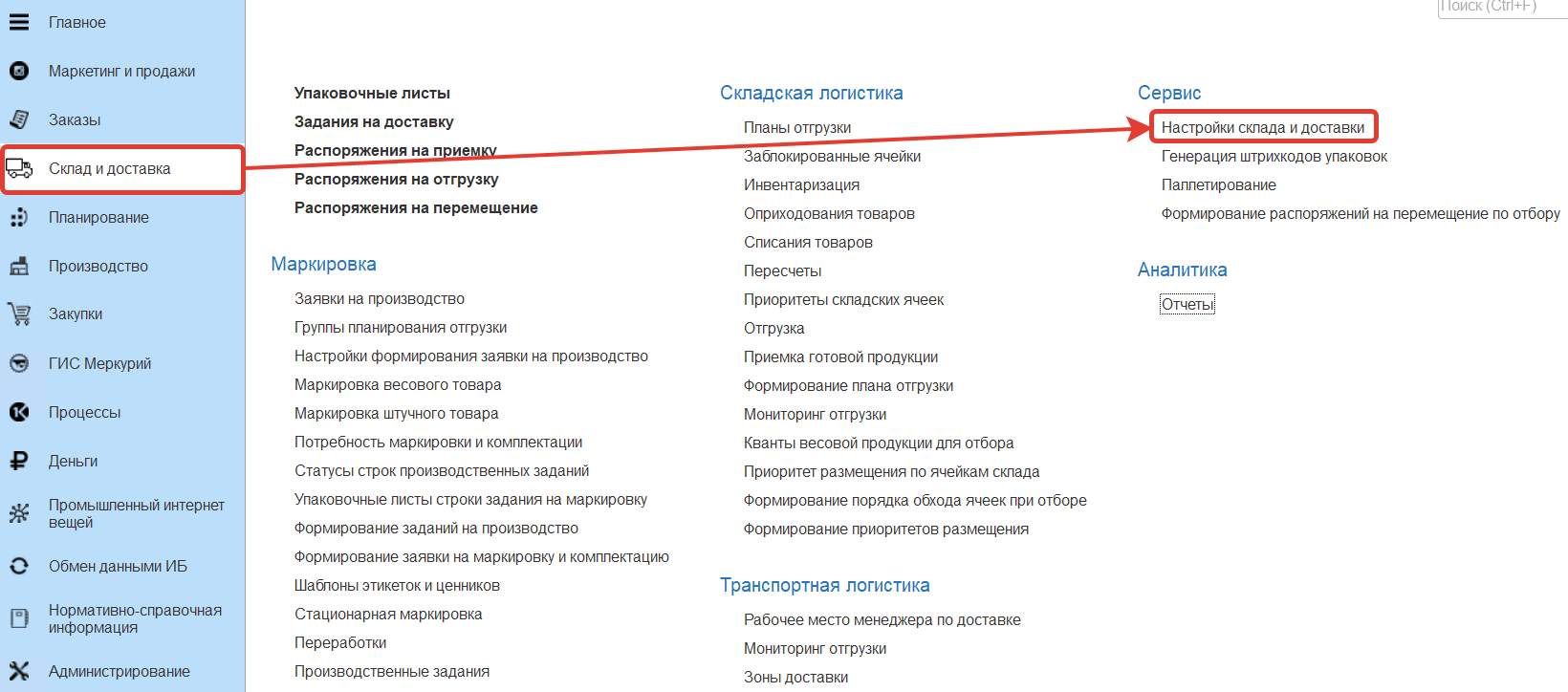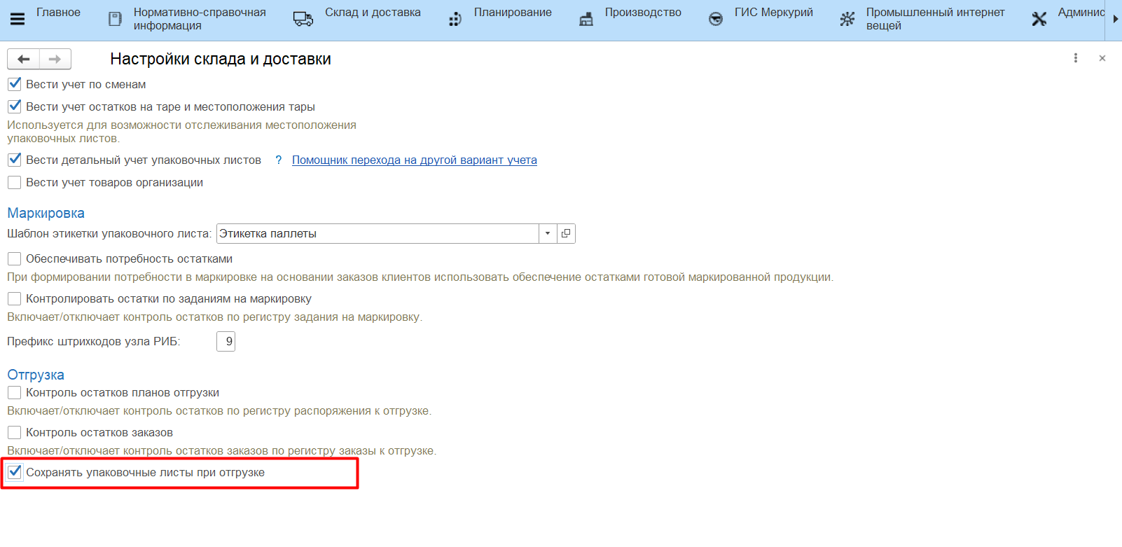 При этом, если отгрузка проводится, например, на другой склад собственной организации, и не нужно очищать остатки на упаковочных листах, чтобы после провести по ним приемку, есть возможность включить функцию "Сохранять упаковочные листы при отгрузке" в подсистеме "Склад и доставка" в разделе "Сервис" - "Настройки склада и доставки".