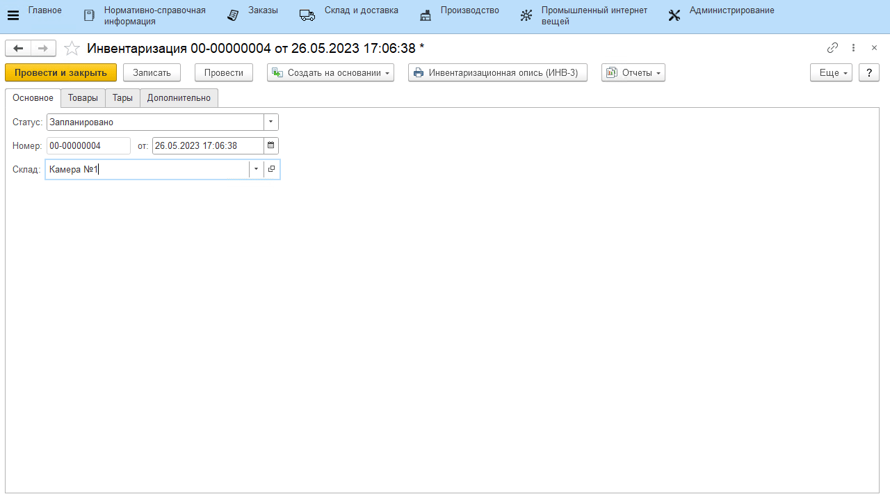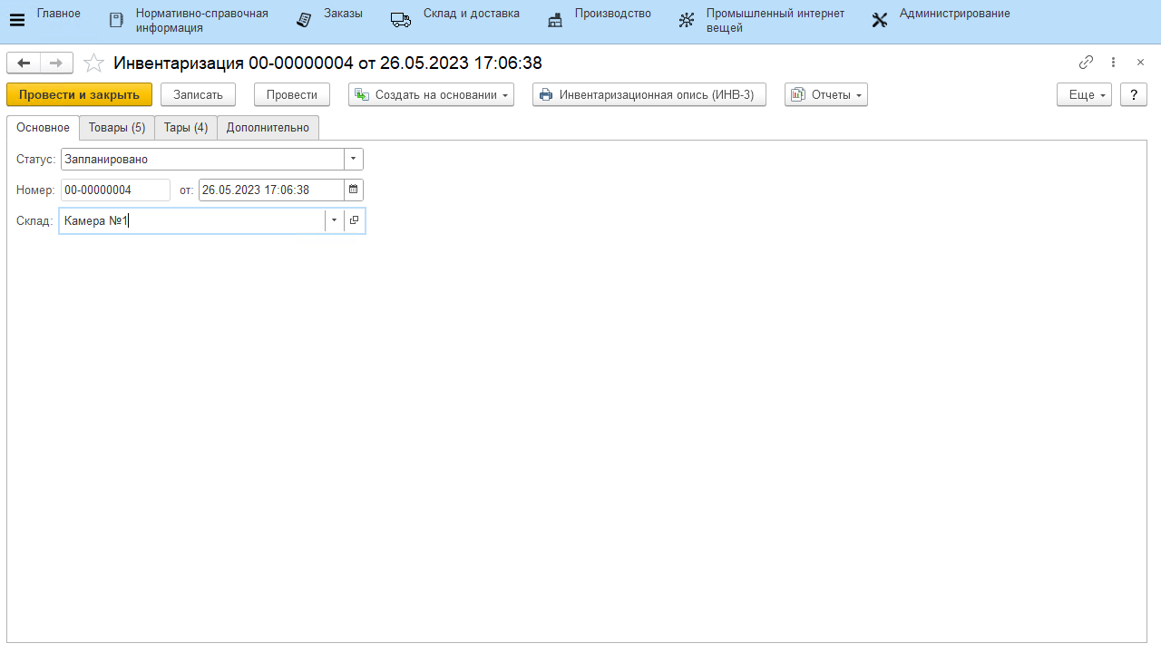 Документ "Инвентаризация" расположен в разделе "Склад и доставка" в подсистеме "Складская логистика".