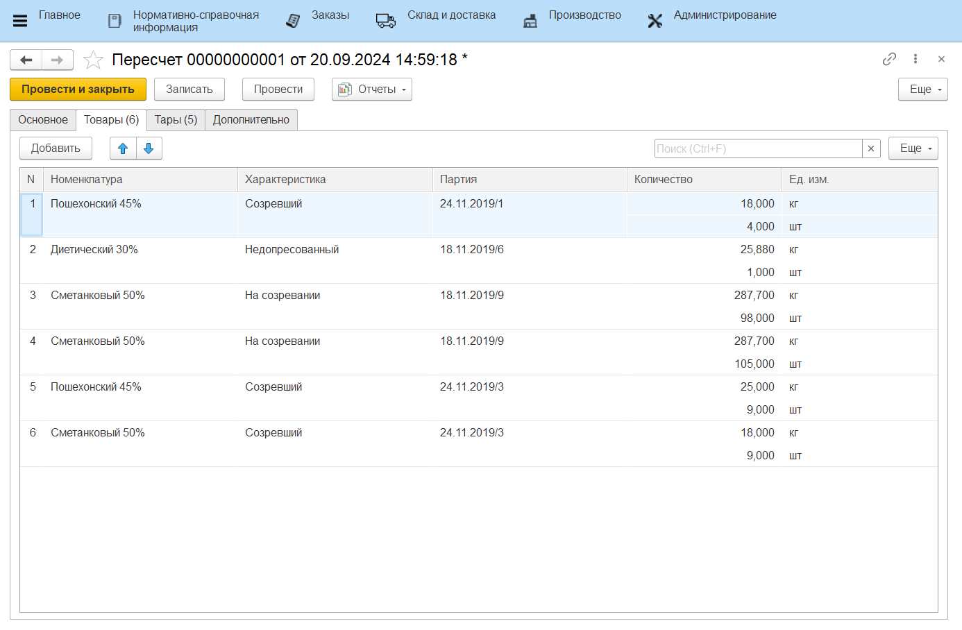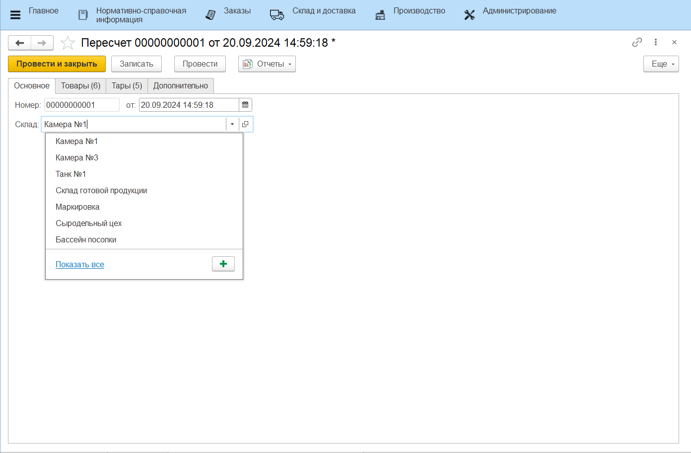 На первом этапе необходимо провести подсчет остатков продукции на складе и занести эти данные в документ "Пересчет", который расположен в разделе "Склад и доставка" в подсистеме "Складская логистика".