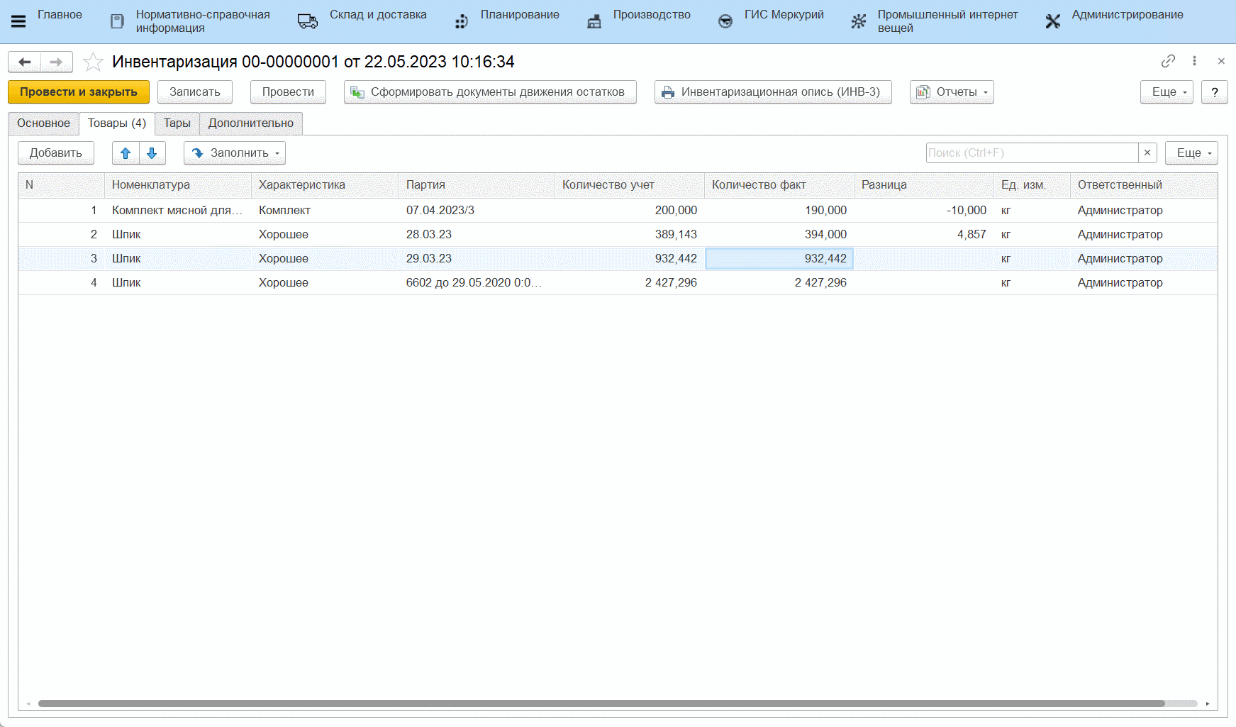 Инвентаризация имущества на складе – это мероприятие в ходе которого проверяется фактическое наличие материально-производственных запасов. Для проведения инвентаризации в системе используется документы "Пересчет" и "Инвентаризация", "Оприходование товаров" и "Списание товаров".